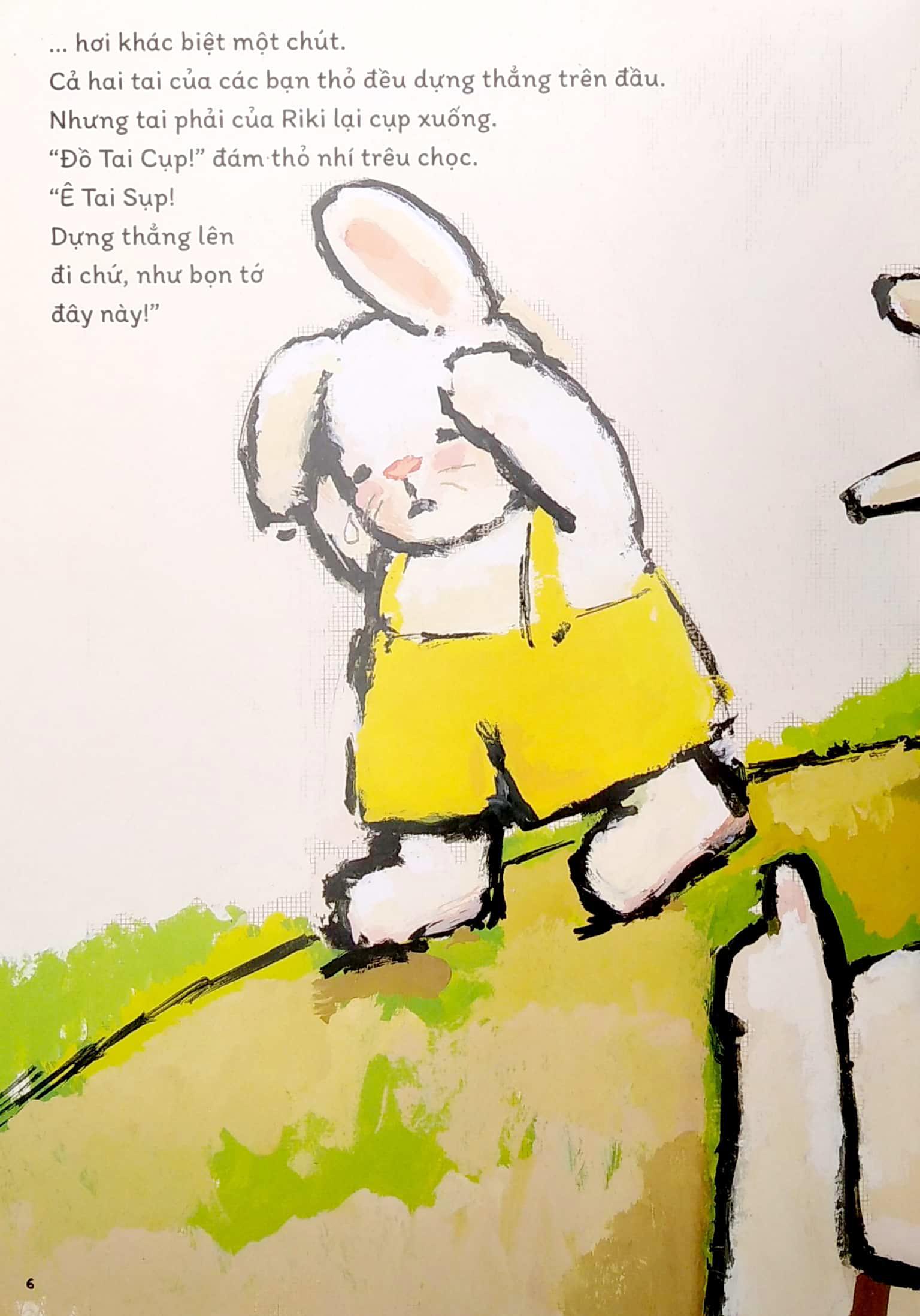 Riki có một chiếc tai cụp. Các bạn thỏ xúm vào cười trêu. Cậu tìm đủ mọi cách để chiếc tai dựng thẳng lên. Cậu treo người trên cành, chèn một củ cà rốt, buộc cả cành cây con, giấu tai trong giành ủ tích trà,… Nhưng chẳng cách nào được cả. Cho đến một ngày kia…