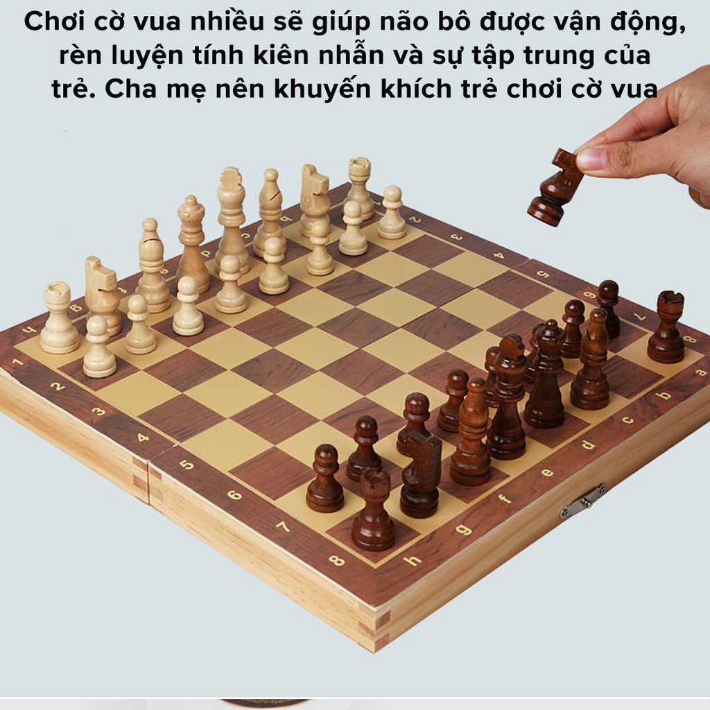 Cờ vua là môn thể thao phát huy trí tuệ logic, giúp trẻ hình thành tư duy xây dựng mục tiêu và chiến lược. Bàn cờ vua, quân cờ đều được làm bằng gỗ thông tự nhiên Có Gắn Nam Châm, đảm bảo chất lượng, giúp quân cờ và bàn cờ giữ được tốt hơn. Mở ra làm bàn, đóng lại là hộp đựng.