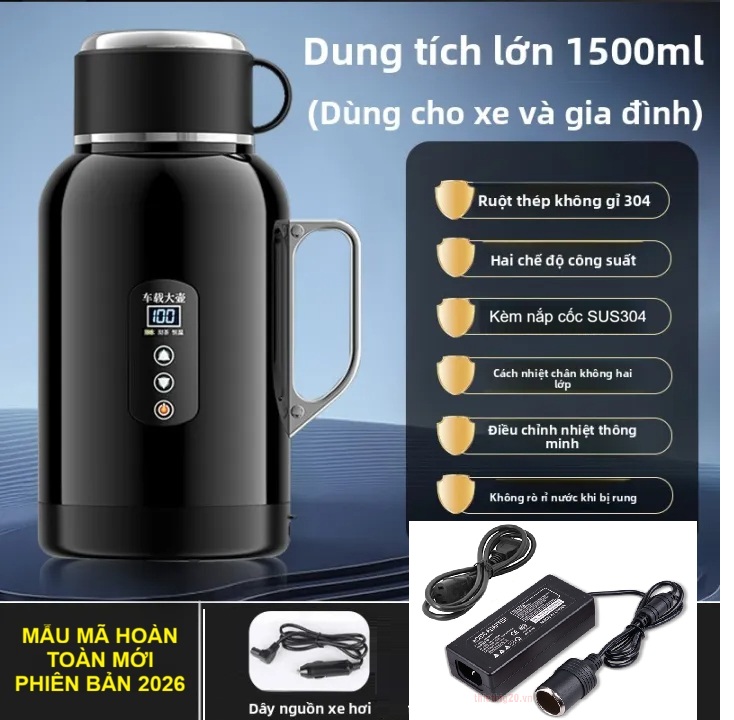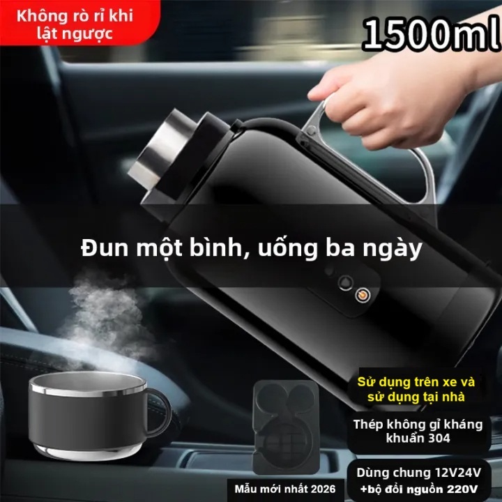 Bình Đun Nước Xe Hơi Giữ Nhiệt Dung Tích Lớn 1500ML 200W SUS304 Chế Độ Nguồn Kép 12V-24V Kèm Bộ Adapter 220V Dùng Trong Gia Đình Và Cho Xe Tải Xe Khách Đường Dài