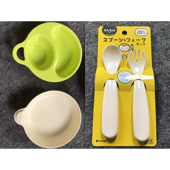 Combo 2 chén ăn dặm và bộ thìa nĩa inomata nhập khẩu Nhật Bản