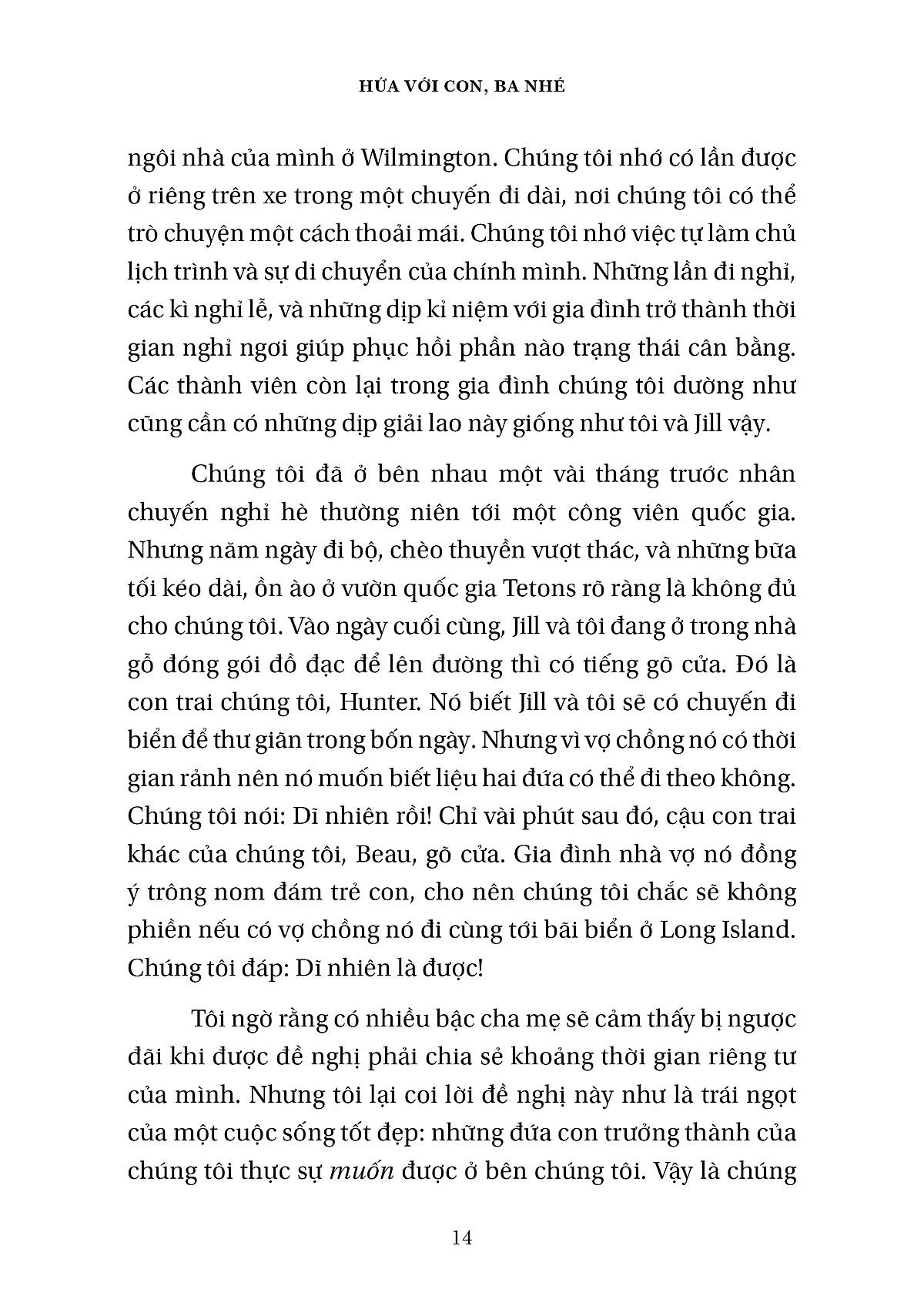 Cuốn sách không chỉ được Joe Biden viết với tư cách là một phó tổng thống, mà còn ở vị thế của một người cha, người ông, người bạn, và người chồng. Hứa với con, Ba nhé là câu chuyện về cách gia đình và bạn bè nâng đỡ chúng ta, và cách niềm hy vọng, mục đích và hành động có thể dẫn lối chúng ta vượt qua đau thương, mất mát cá nhân để tiến tới ánh sáng của một tương lai mới.