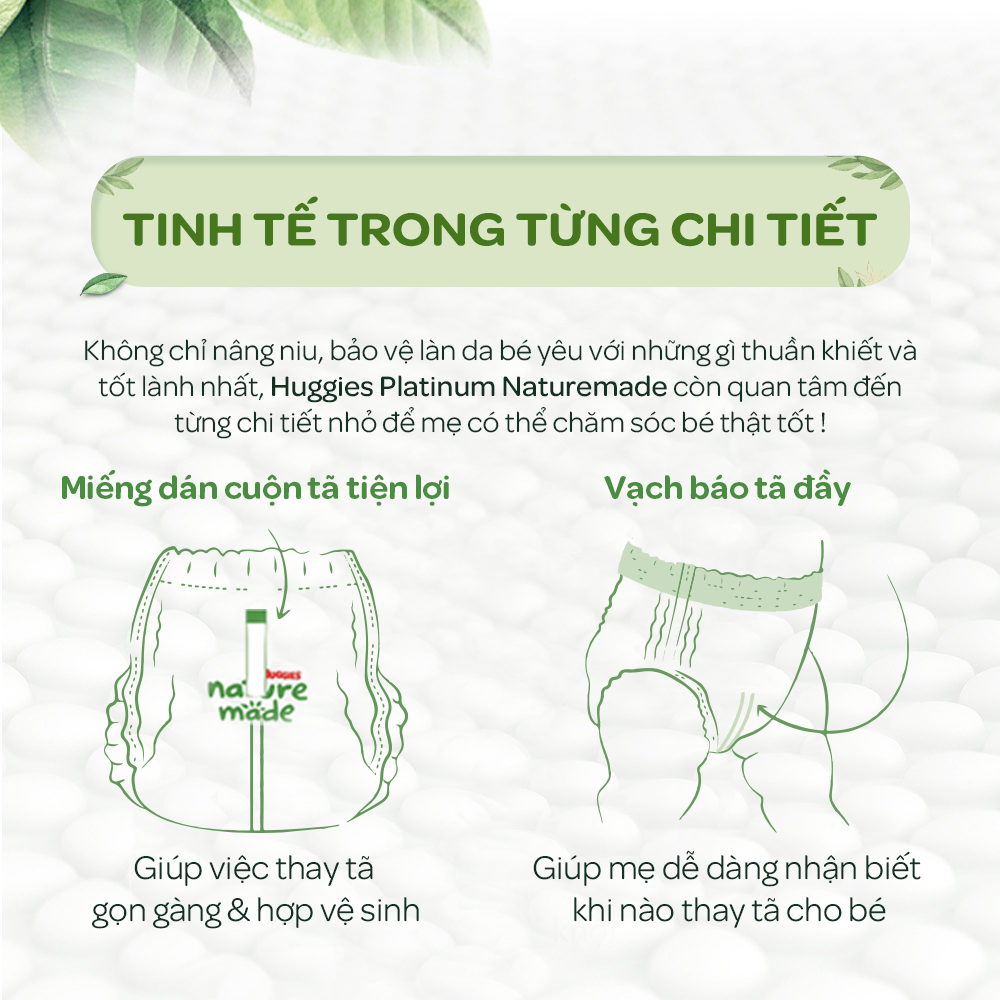 Không chỉ nâng niu, bảo vệ làn da bé yêu với những gì thuần khiết và tốt lành nhất, Huggies Platinum Nature Made còn quan tâm đến từng chi tiết nhỏ để mẹ có thể chăm sóc bé thật tốt!