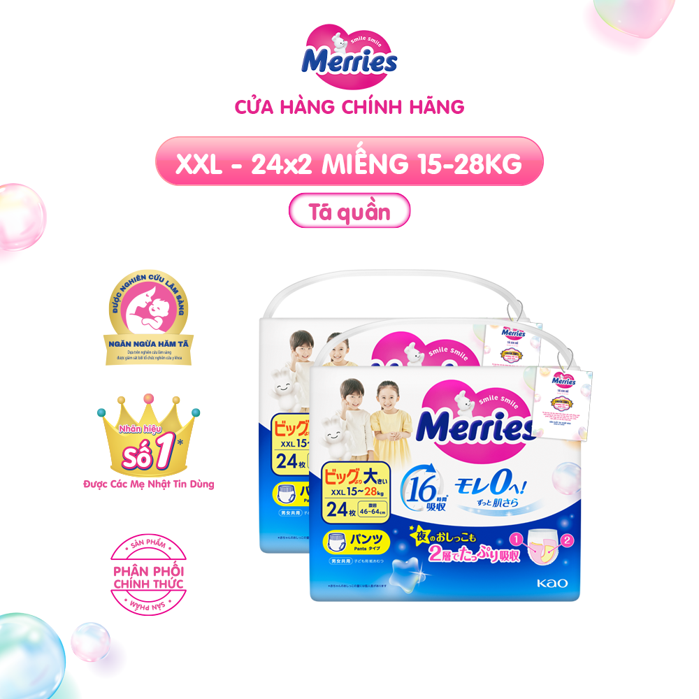 Tã Merries có mặt tại Việt Nam từ năm 2014, được nhập khẩu đạt tiêu chuẩn và chất lượng được kiểm tra nghiêm ngặt bởi Kao Việt Nam, được dán tem tiếng Việt để dễ dàng sử dụng và thấy ngay hạn sử dụng vì vậy cho đến nay, tã Merries vẫn luôn nhận được sự tin dùng của các bà mẹ Việt.