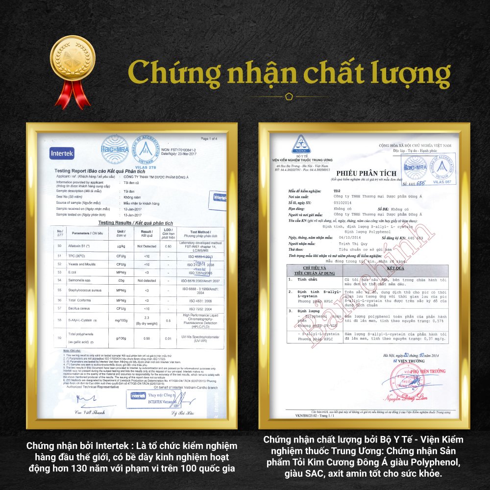 Tỏi Kim Cương Đông Á được đánh giá chất lượng bởi các tổ chức uy tín trong và ngoài nước như: FDA Hoa Kỳ, Cục An toàn Thực phẩm, Tỏ chức kiểm nghiệm quốc tế Intertek và Viện Kiểm nghiệm thuốc Trung Ương. Đảm bảo mang đến cho người tiêu dùng sản phẩm chất lượng cao cho sức khỏe, với tiêu chuẩn - đánh giá khắt khe bởi một đơn vị dược phẩm.