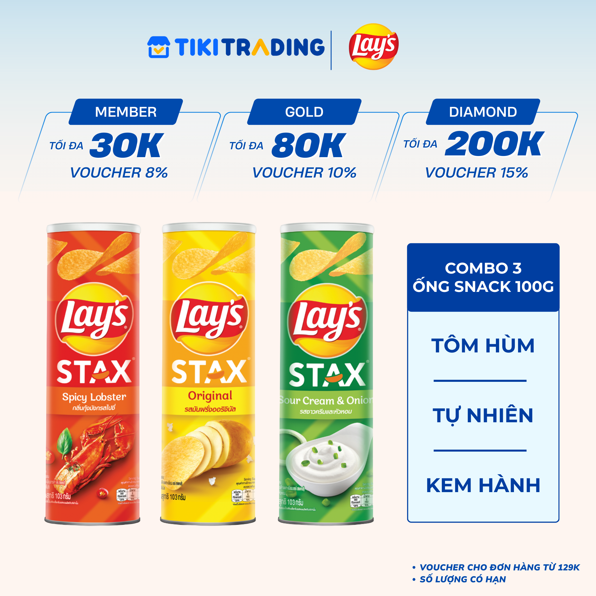 Thông số kỹ thuật Combo 3 Lay's Stax 100gr (Tự nhiên, Tôm hùm nướng ngũ vị, Kem chua hành)