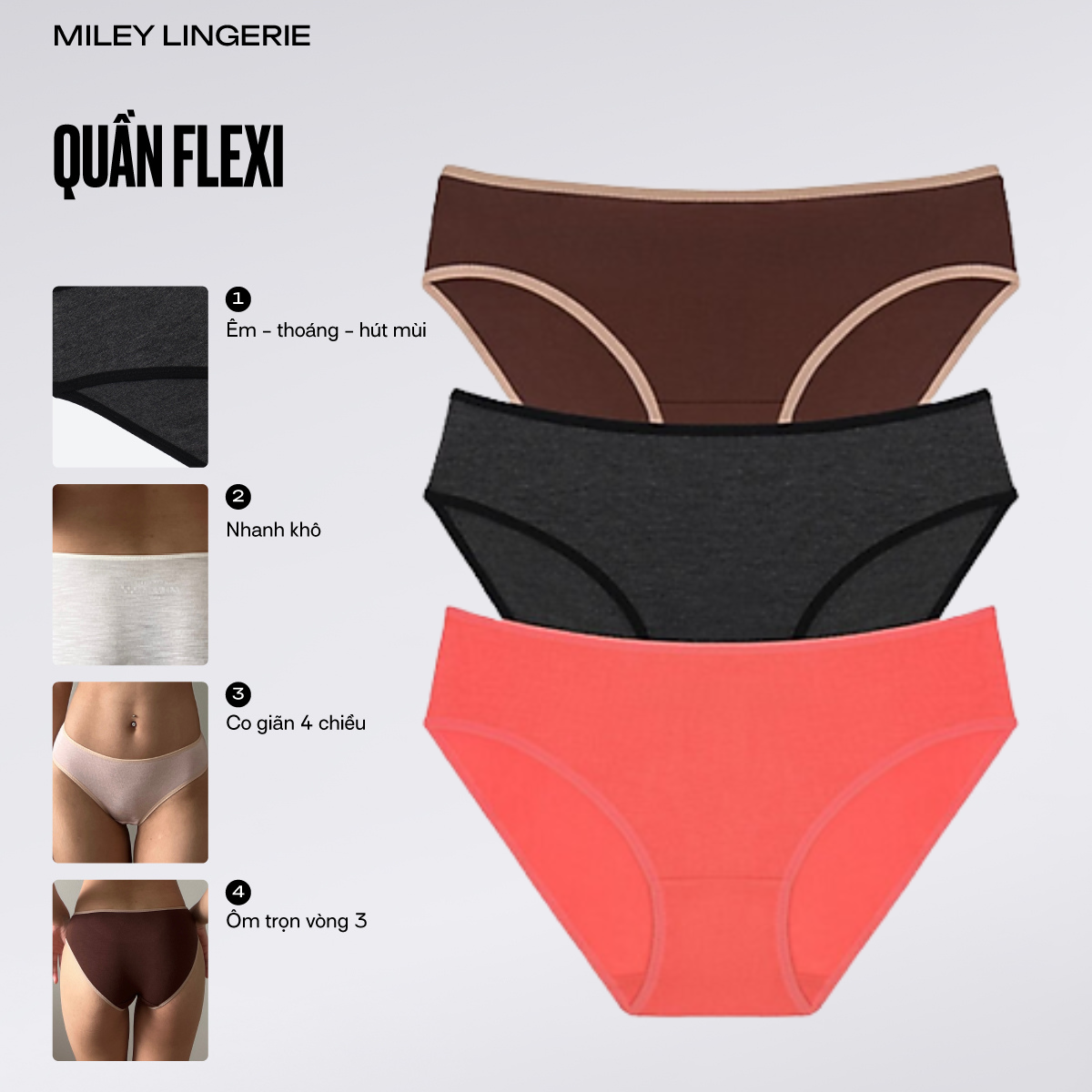 Thông số kỹ thuật Combo 3 quần lót nữ cotton co dãn 4 chiều Flexi Miley Lingerie - Giao màu ngẫu nhiên