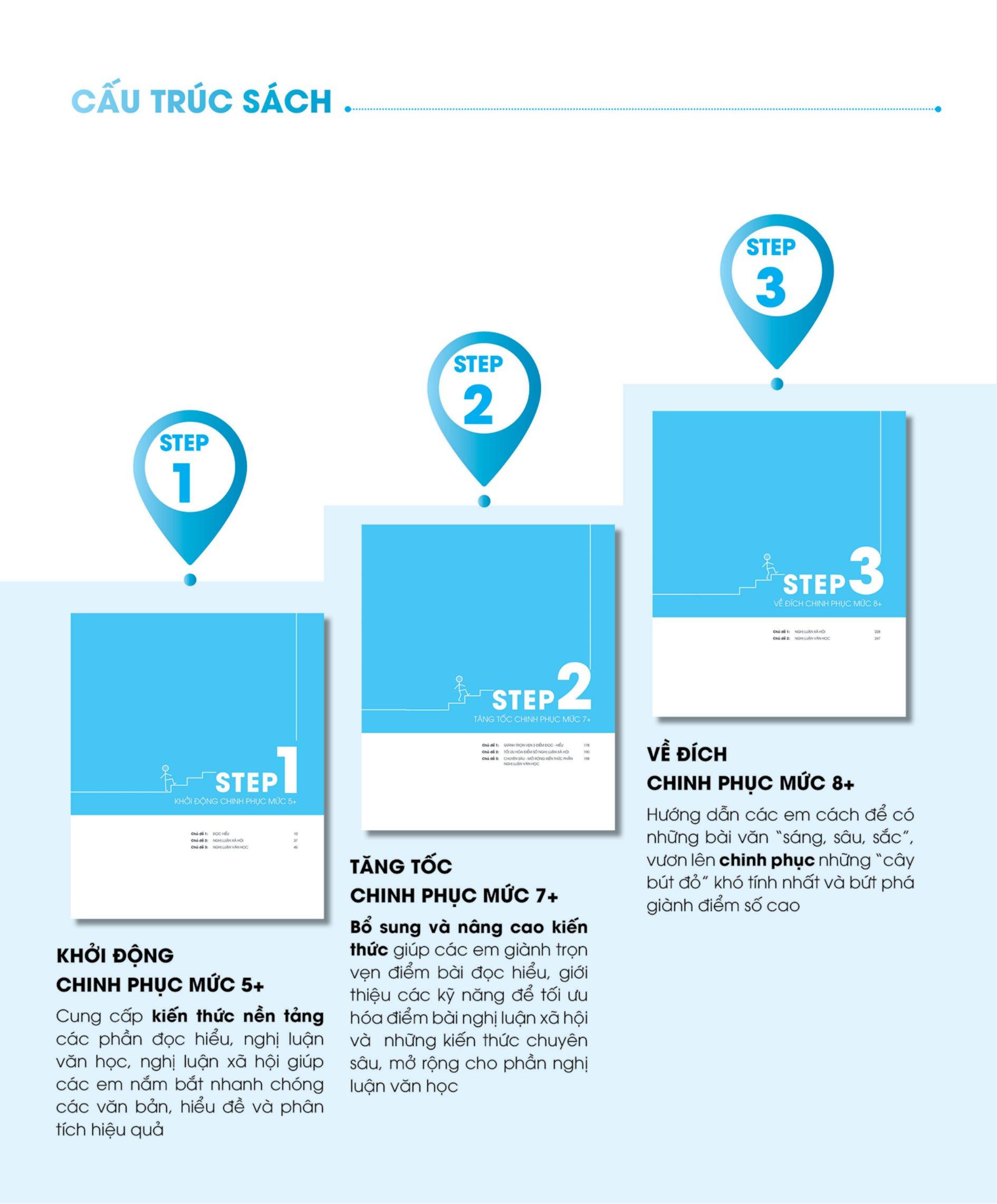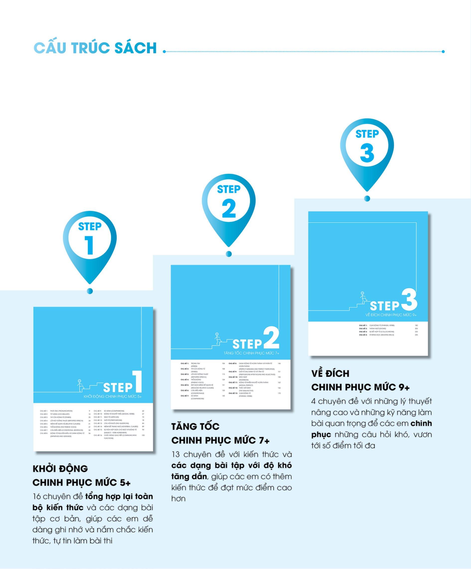 Chính vì thế, bộ sách 3 Step – Tiết lộ bí quyết 3 bước đạt điểm 8+ được ra đời với mục đích giúp các em định hướng lộ trình và hệ thống kiến thức một cách bài bản, dễ học nhất – Với độ khó tăng dần, tương ứng với mức điểm thi mong mục tiêu tăng dần.