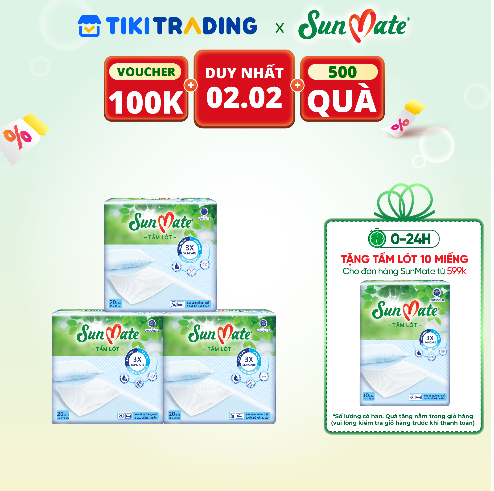 Thông số kỹ thuật Combo 3 Tấm lót SunMate cải tiến mới 20 miếng/gói size M (45 x 70cm)