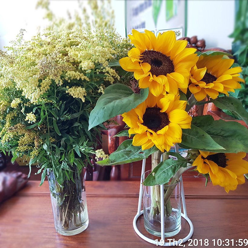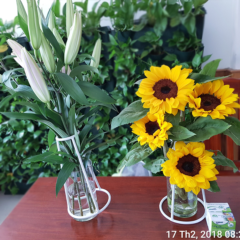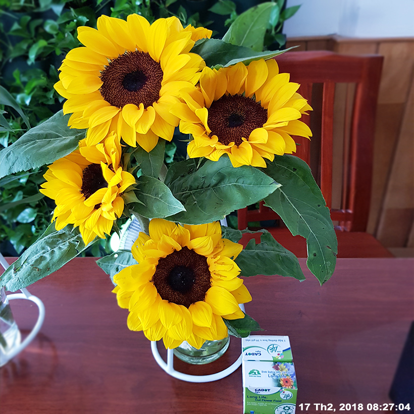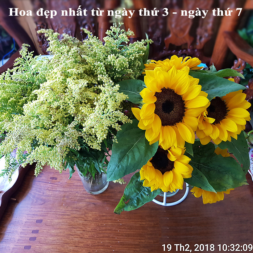 Lúc mua hoa Hướng Dương từ chợ, hoa đã rất héo và yếu dần. Nhưng khi được cắm vào bình có pha gói dưỡng hoa tươi lâu Long Life từ ngày 6/2/2018 đã có sự khác biệt giữa nước thường và gói dưỡng hoa