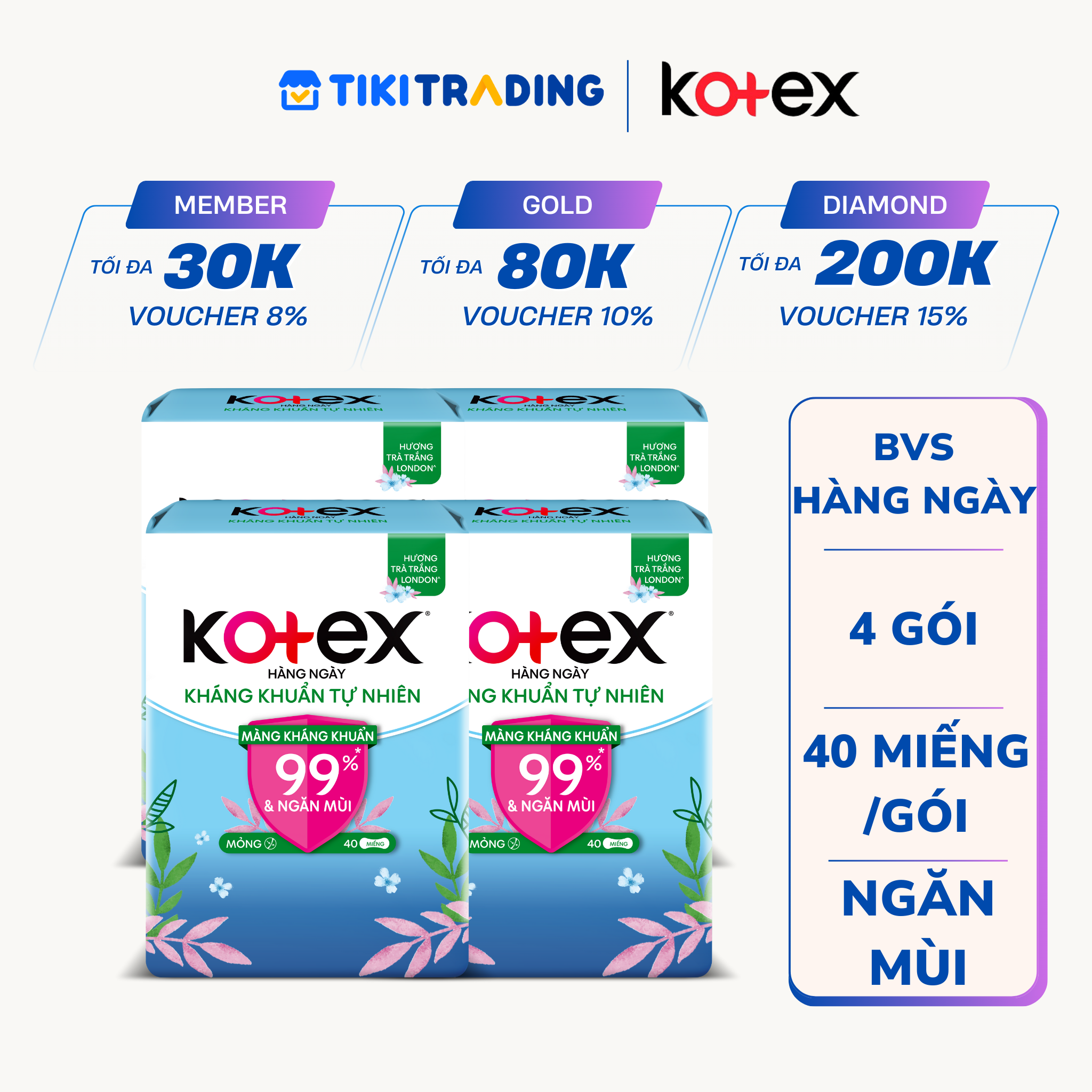 Thông số kỹ thuật Combo 4 Băng Vệ Sinh Kotex Hằng Ngày Kháng Khuẩn Hương Tự Nhiên - Gói 40 miếng