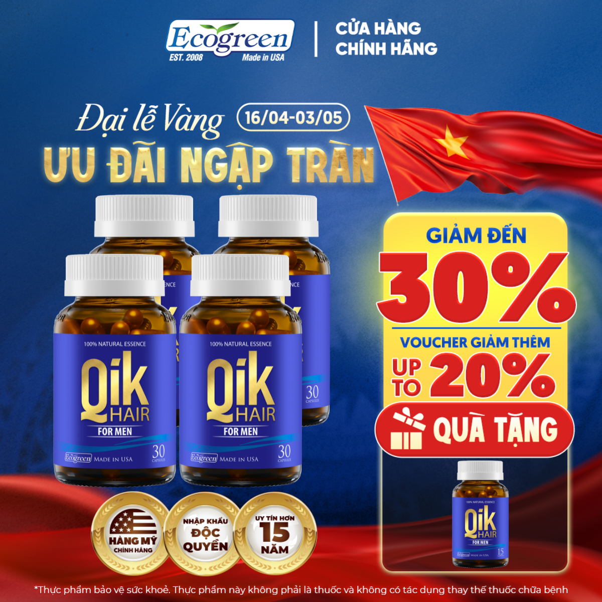 Thông số kỹ thuật [Tặng Hộp 15v] Combo 4 Hộp 30v - Viên Uống Mọc Tóc Qik Hair For Men Ecogreen Giảm Rụng Tóc Cho Nam