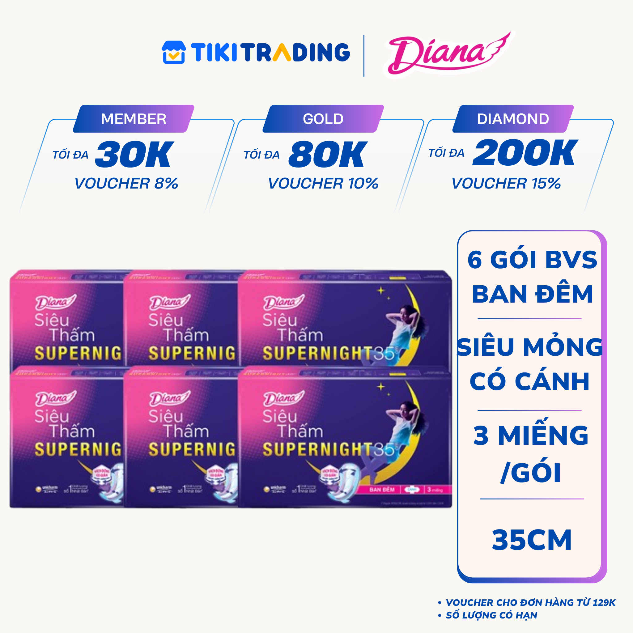 - Combo 6 Băng Vệ Sinh Diana Super Night 35cm (Gói 3 Miếng) được các chuyên gia nghiên cứu và phát triển để góp phần tạo cho phái đẹp một giấc ngủ sâu trọn vẹn trong những ngày nhạy cảm.