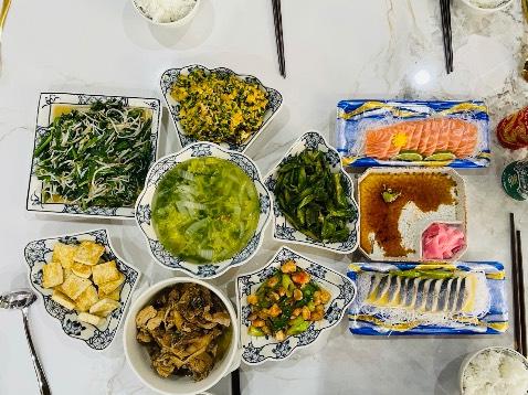 1- Bộ mặt trời 15 món( 6 đĩa cánh hoa, 6 bát cơm, 1 bát tô và 2 chén chấm)