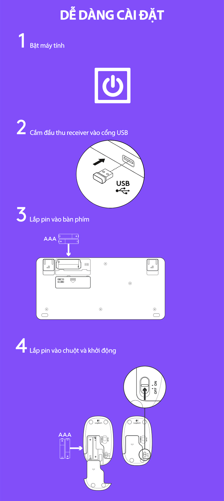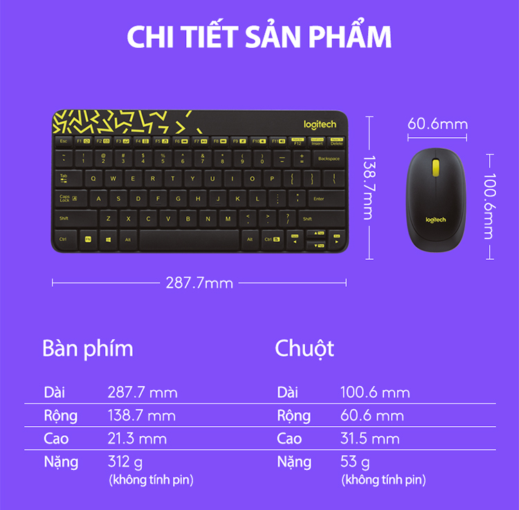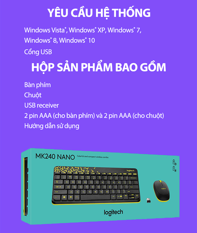 Thông số kỹ thuật Combo chuột phím không dây Logitech MK240 - Hàng chính hãng