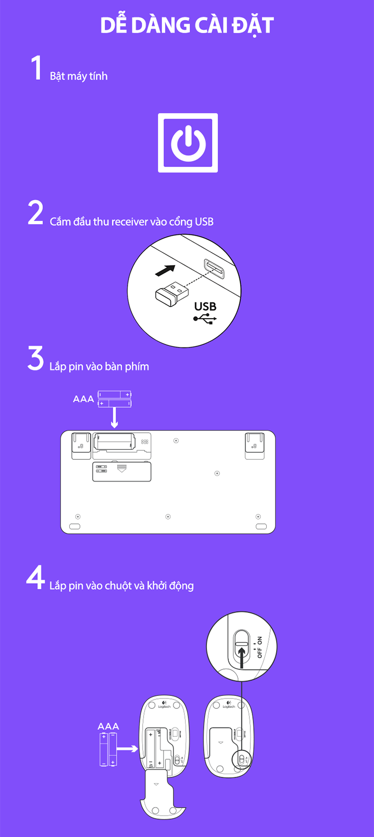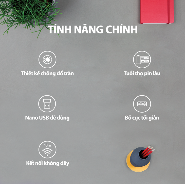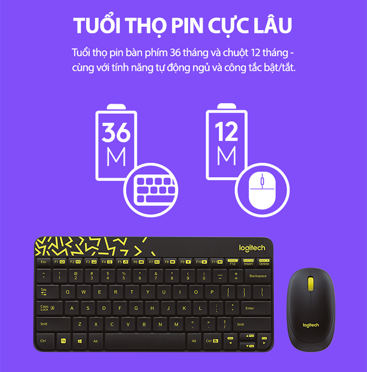 Tuổi thọ pin cho bàn phím tới 36 tháng và chuột tới 12 tháng, cùng với chế độ auto-sleep và nút bật/tắt.