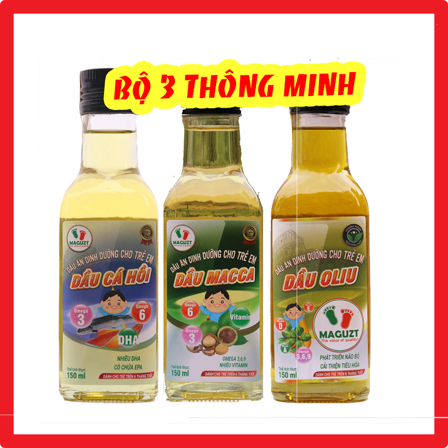 Bộ 3 dầu ăn dặm cho bé Thông Minh hiệu quả bao gồm Dầu Cá Hồi, Dầu Oliu và Dầu Macca.