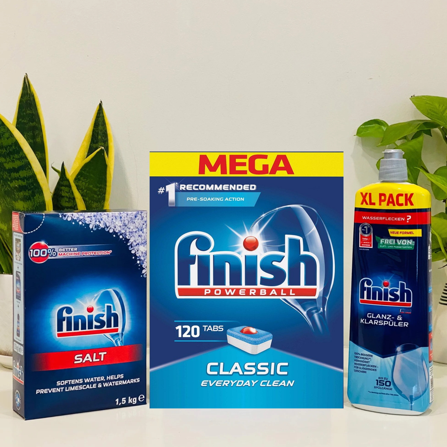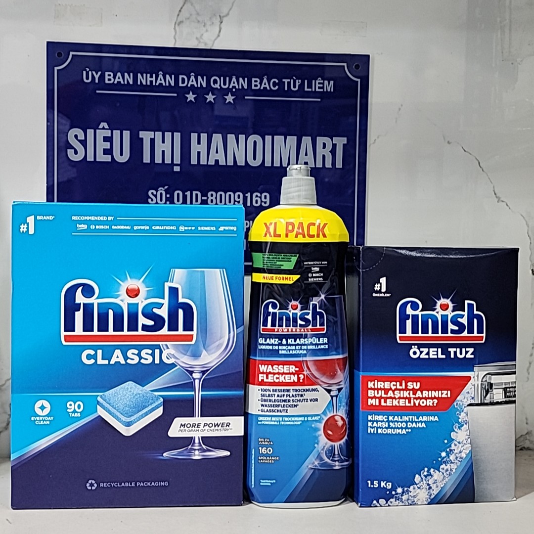 Combo: Viên rửa Finish 120 viên + Muối rửa bát Finish 1.5kg + Nước làm bóng Finish 800ml Chuyên dùng cho máy rửa bát chén