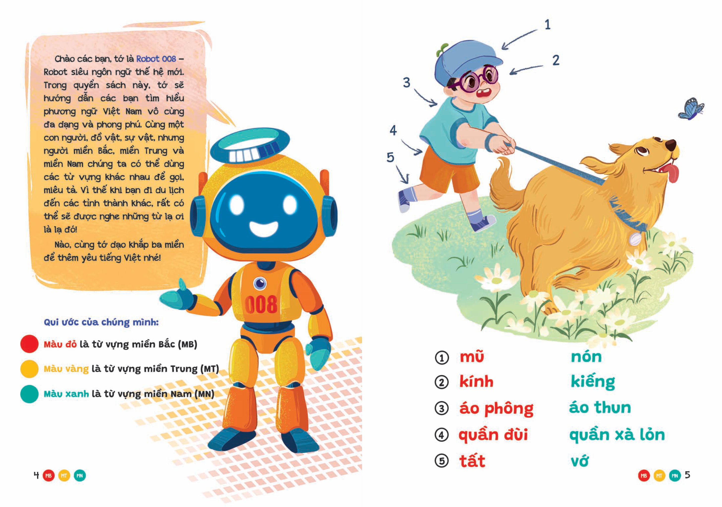 - Chào các bạn, tớ là Robot 008 - Robot siêu ngôn ngữ thế hệ mới. Trong quyển sách này, tớ sẽ hướng dẫn các bạn tìm hiểu phương ngữ Việt Nam vô cùng đa dạng và phong phú. Cùng một con người, đồ vật, sự vật nhưng người miền Bắc, miền Trung và miền Nam có thể dùng các từ vựng khác nhau để gọi, miêu tả. Vì thế khi bạn đi du lịch đến các tỉnh thành khác, rất có thể sẽ được nghe những từ lạ ơi là lạ đó!