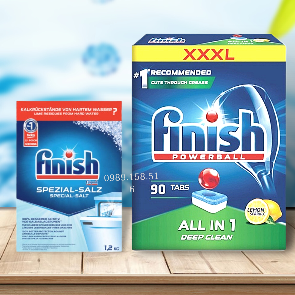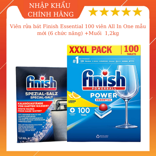 - Viên rửa bát Finish All in one 100 viên: là viên rửa bát tổng hợp, 6 chức năng tẩy rửa, tổng hợp cả Muối làm mềm nước và Nước làm bóng. Tuy nhiên đối với những vùng có nước nặng, nhiều kim loại, hãng Finish khuyến cáo nên sử dụng thêm sản phẩm Muối làm mềm nước để bảo vệ máy khỏi cặn vôi giúp nâng cao tuổi thọ của máy rửa bát.