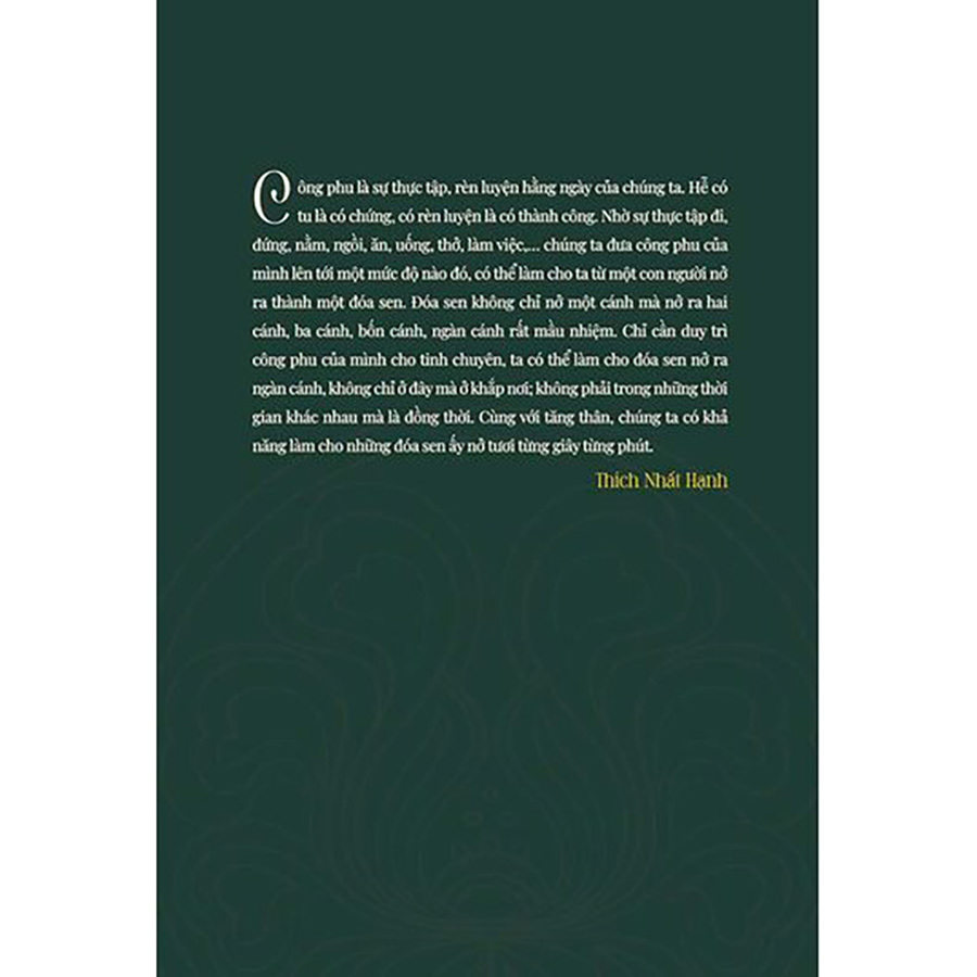 Công phu là sự thực tập, là sự rèn luyện hằng ngày của chúng ta. Hễ có tu là có chứng, có rèn luyện là có thành công. Nhờ sự thực tập đi, đứng, nằm, ngồi, ăn, uống, thở, làm việc,… chúng ta đưa công phu của mình lên tới một mức độ nào đó, có thể làm cho ta từ một con người nở ra thành một đóa sen. Đóa sen không chỉ nở một cánh mà nở ra hai cánh, ba cánh, bốn cánh, ngàn cánh rất mầu nhiệm. Chỉ cần duy trì công phu của mình cho tinh chuyên, ta có thể làm cho đóa sen nở ra ngàn cánh, không chỉ ở đây mà ở khắp nơi; không phải trong những thời gian khác nhau mà là đồng thời. Cùng với tăng thân, chúng ta có khả năng làm cho những đóa sen ấy nở tươi từng giây từng phút.