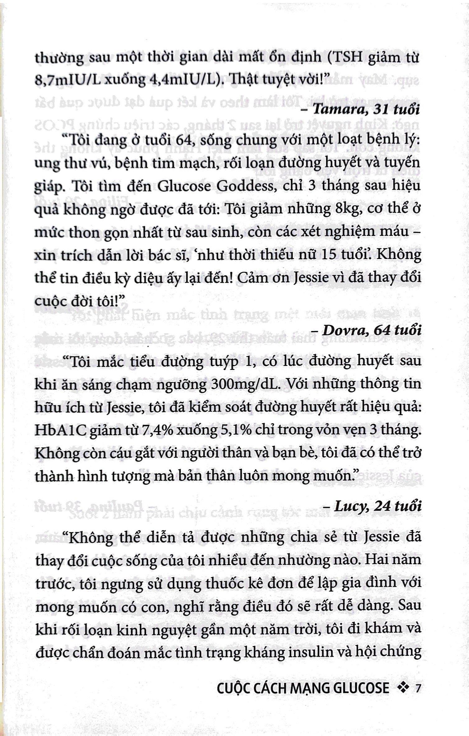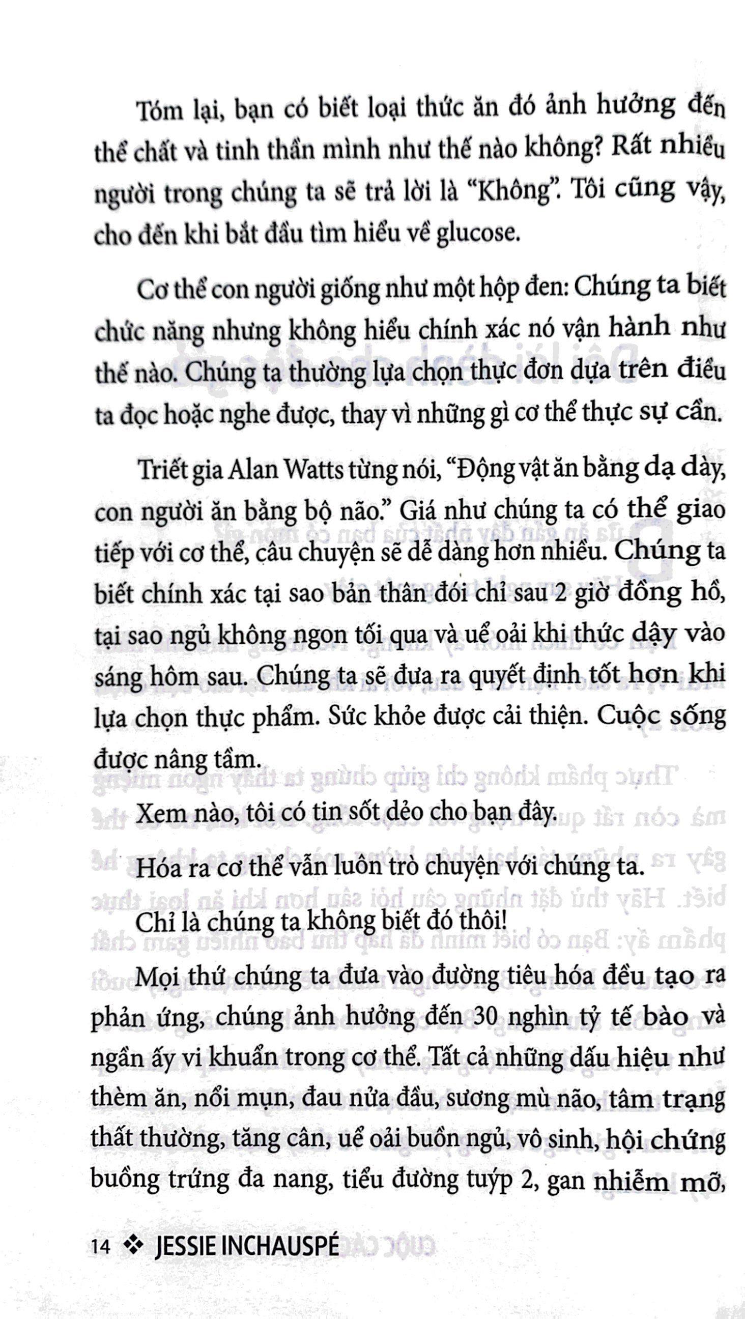 Bằng cách trình bày thú vị và ngắn gọn những dữ liệu khoa học cấp tiến, kết hợp với văn phong hài hước nhưng rất đỗi chân thành, Jessie Inchauspé đã giúp đỡ được vô số người trên khắp thế giới – những cá nhân đang chật vật tìm cách cải thiện vấn đề sức khỏe mà không phải ăn kiêng ngặt nghèo hoặc vĩnh viễn từ bỏ món ăn yêu thích.
