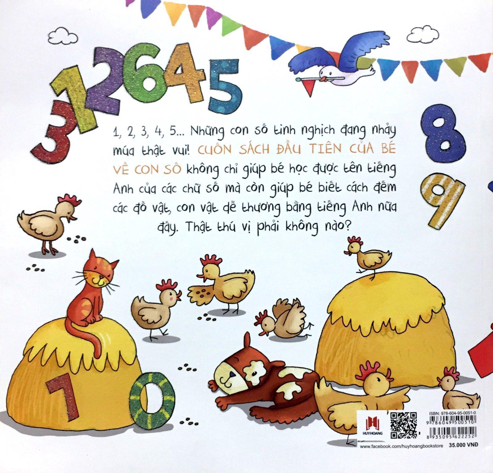 SÁCH ĐẸP VÀ CÓ NỘI DUNG PHONG PHÚ, MÀU SẮC SINH ĐỘNG. TÊN SÁCH LÀ "CUỐN SÁCH ĐẦU TIÊN CỦA BÉ VỀ CON SỐ" NHƯNG LÀ SÁCH SONG NGỮ, CÓ THỂ KHAI THÁC KHÔNG CHỈ ĐỂ BÉ LÀM QUEN VỚI CÁC CON SỐ MÀ CÒN RẤT THÍCH HỢP ĐỂ BÉ BẮT ĐẦU TIẾP XÚC VỚI TỪ TIẾNG ANH ĐƠN GIẢN.
