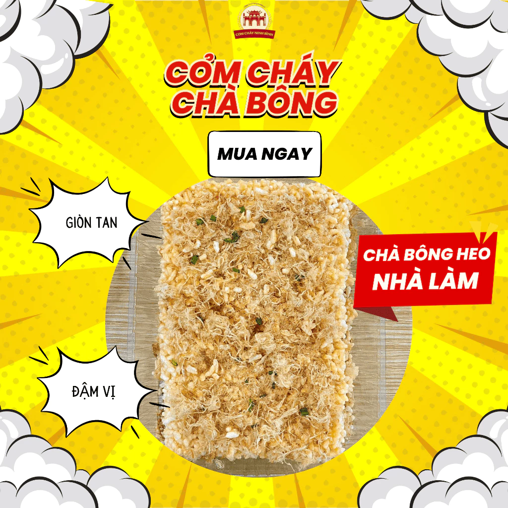 Mỗi miếng cơm cháy chà bông Ninh Bình là sự hòa quyện hoàn hảo giữa vị mặn ngọt hài hòa của nước sốt, vị béo bùi của nếp và chà bông thơm lừng, mang đến trải nghiệm ăn vặt hấp dẫn, khó quên.