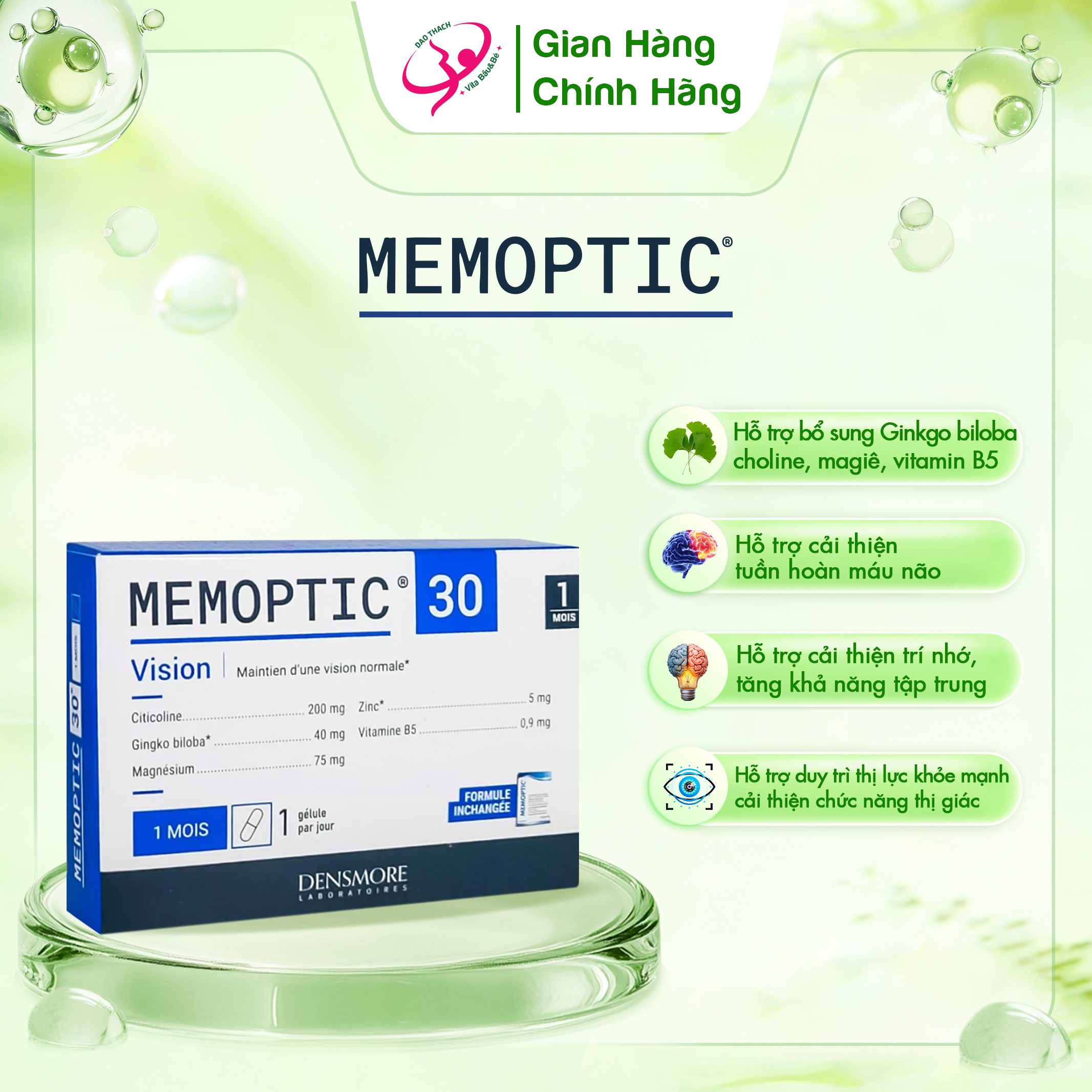 Memoptic bổ sung Ginkgo biloba, choline, magiê, vitamin B5 giúp cải thiện tuần hoàn máu não, giúp tăng cường sự tổng hợp dẫn truyền thần kinh, bảo vệ thần kinh, giúp duy trì và cải thiện trí nhớ, tăng khả năng tập trung.