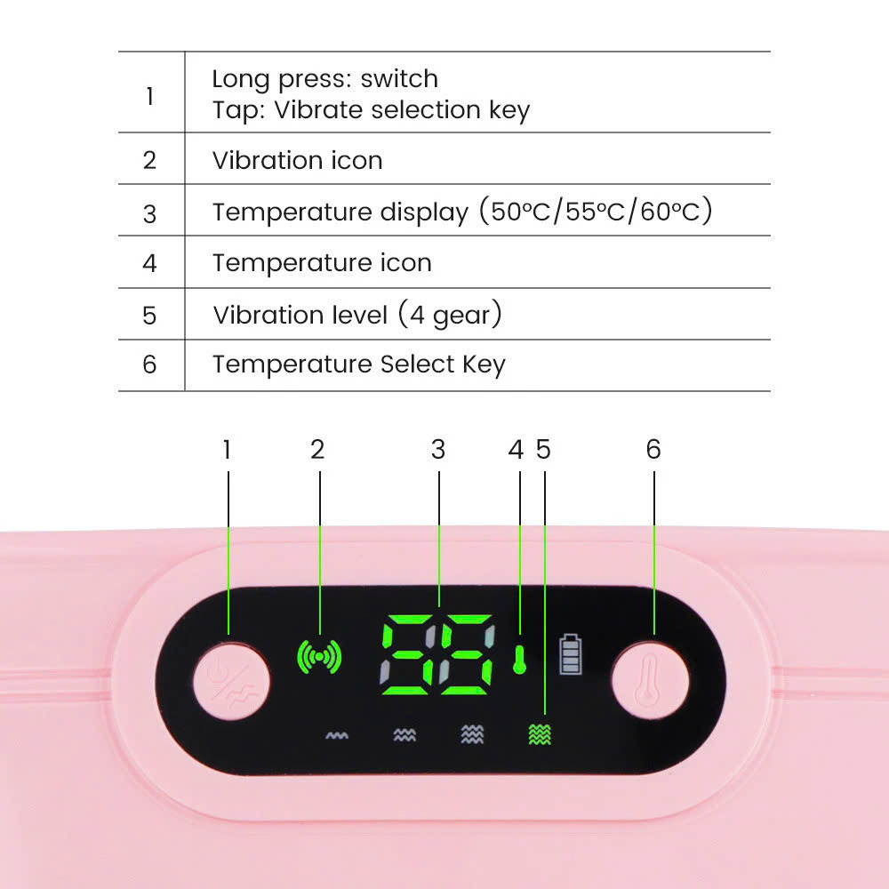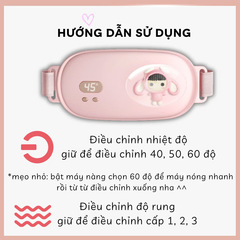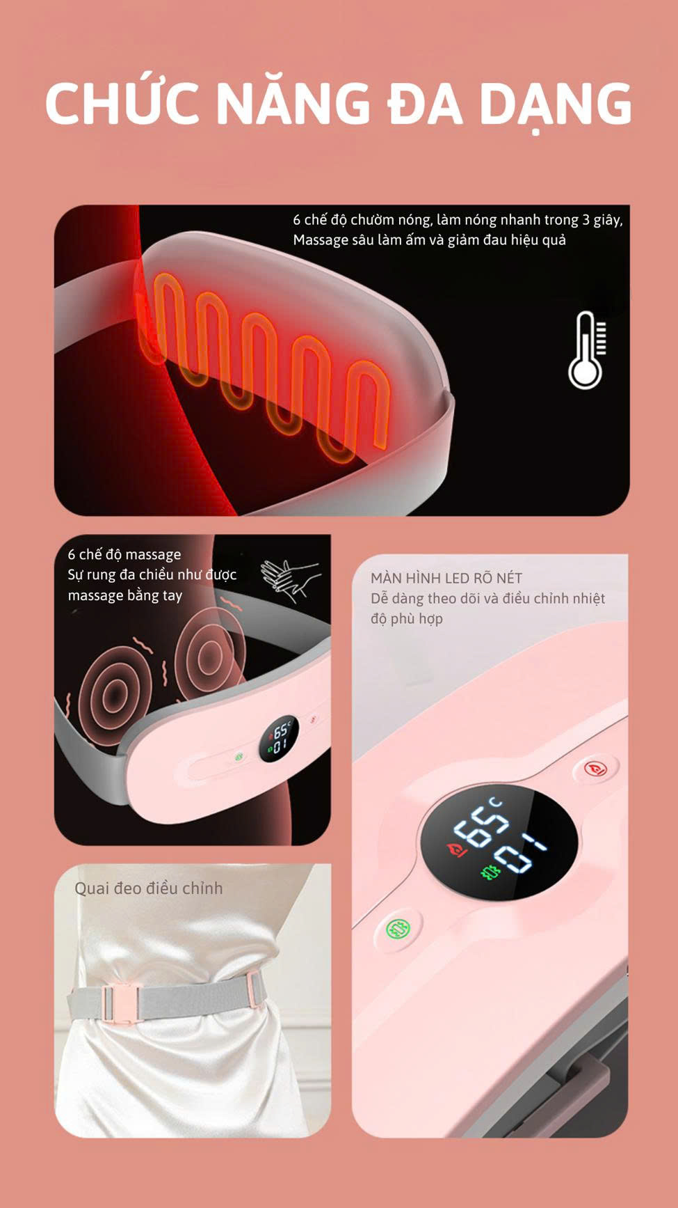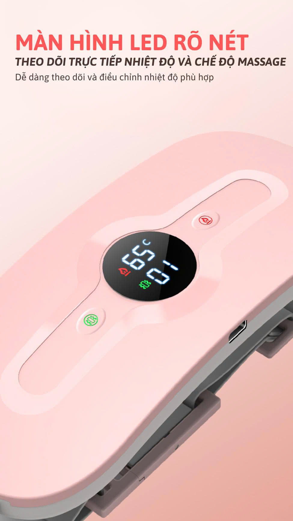 Đai gồm có 3 mức nhiệt độ (40 độ C giữ ấm hàng ngày, 50 độ C chăm sóc kinh nguyệt, 60 độ C giúp giảm đau bụng khi đến tháng)