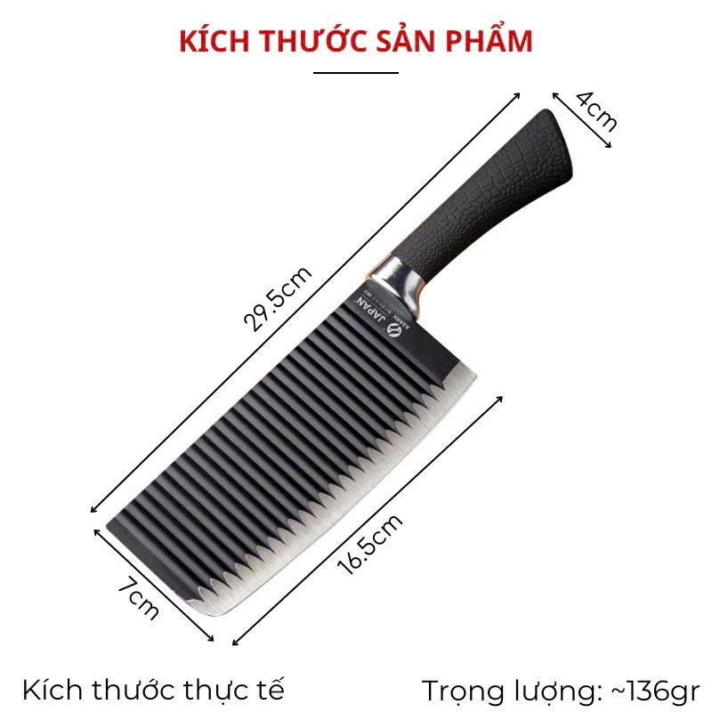 Thông số kỹ thuật Dao bếp Nhật thiết kế gợn sóng giảm tiếp xúc với thực phẩm , chống dính ,không rỉ , sắc bén cán dao bọc cao su êm ái chống trơn trượt khi cầm