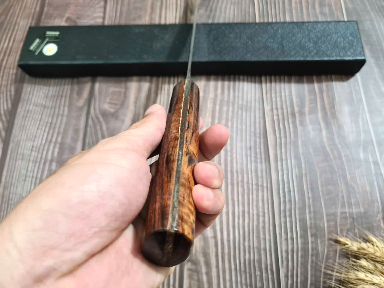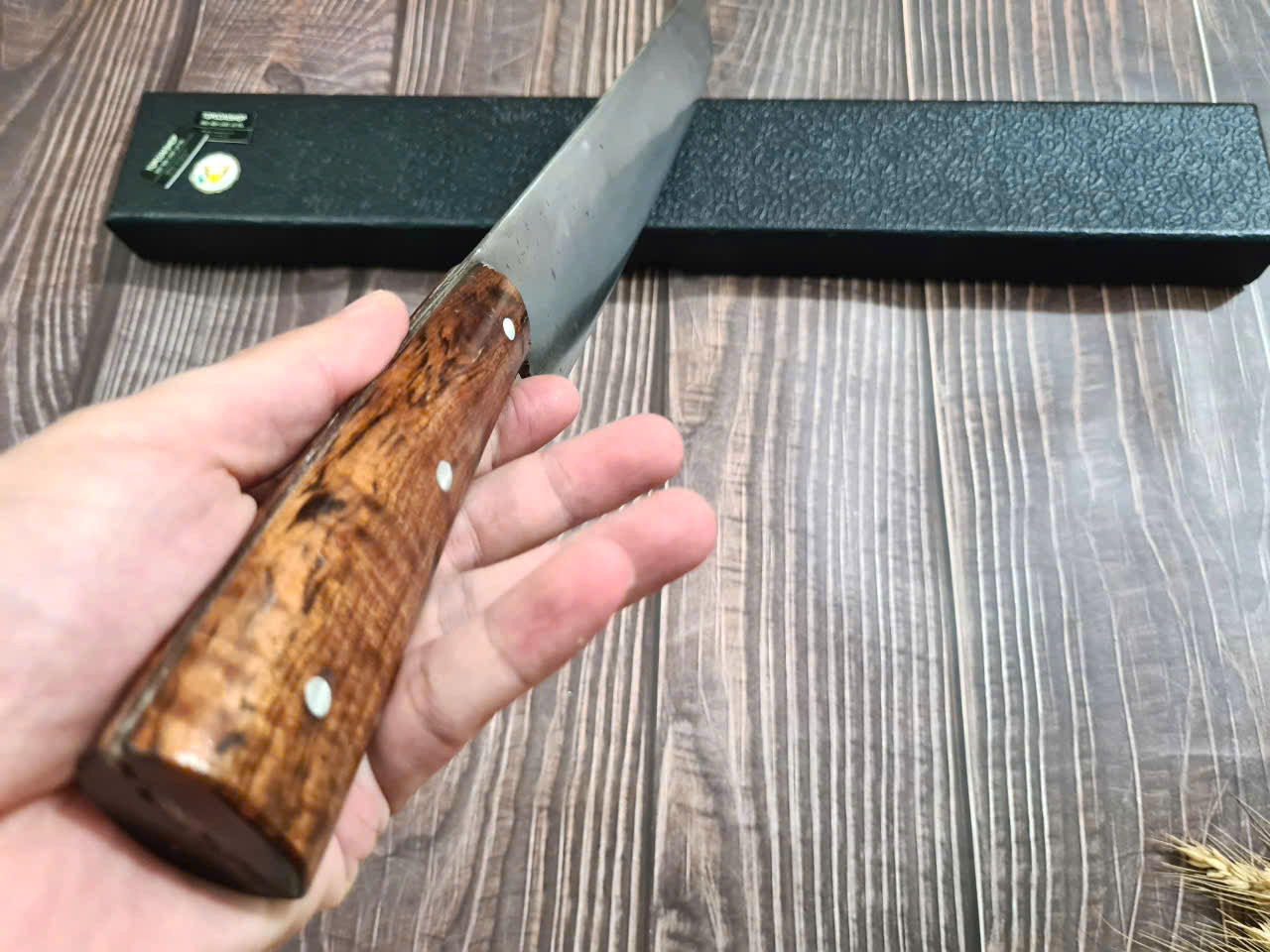 - Cán dao làm từ gỗ cẩm chỉ sang trọng, tay cầm hơi phình ở giữa giúp cầm nắm chắc chắn hơn.