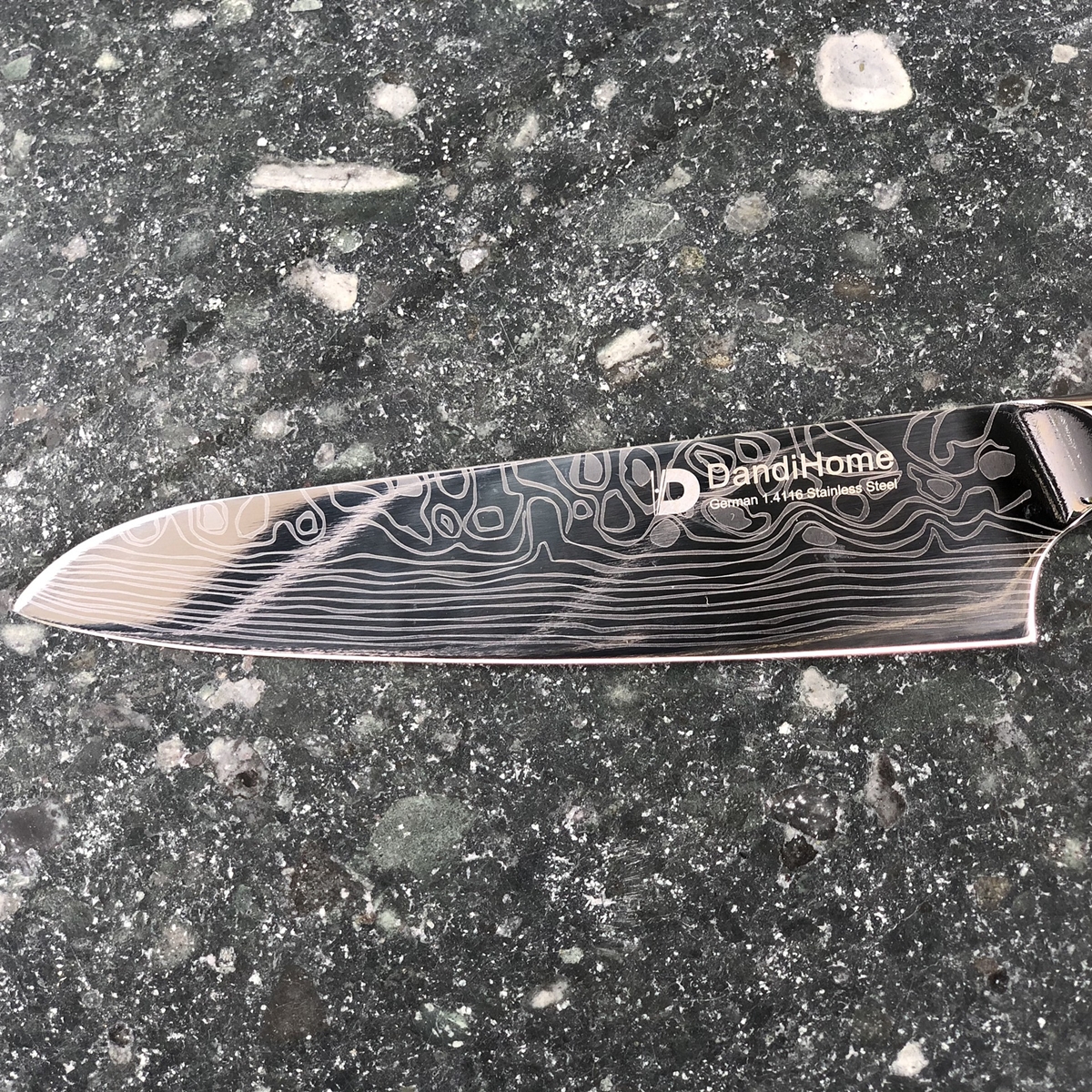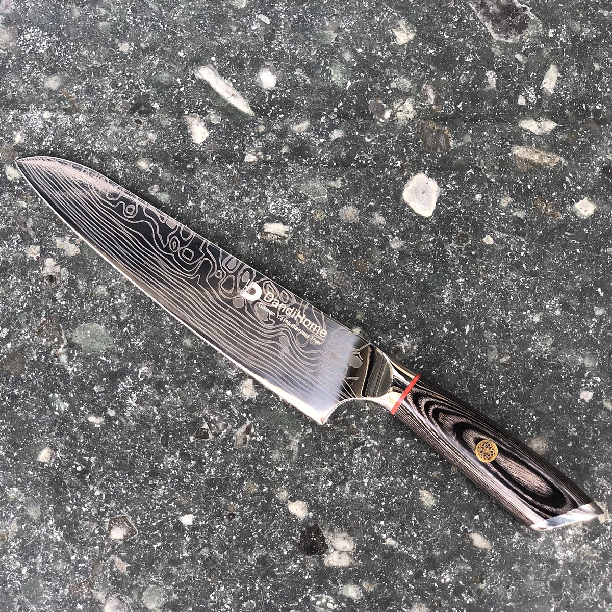 - Dao đầu bếp (Chef’s Knife): là loại dao quan trọng nhất trong bộ dao bếp. Được sử dụng để cắt, thái, băm, xắt các loại thực phẩm khác nhau. Dao đầu bếp DandiHome có chiều dài lưỡi dao 8 inch. Được làm từ thép German 1.4116 hoặc thép VG10.