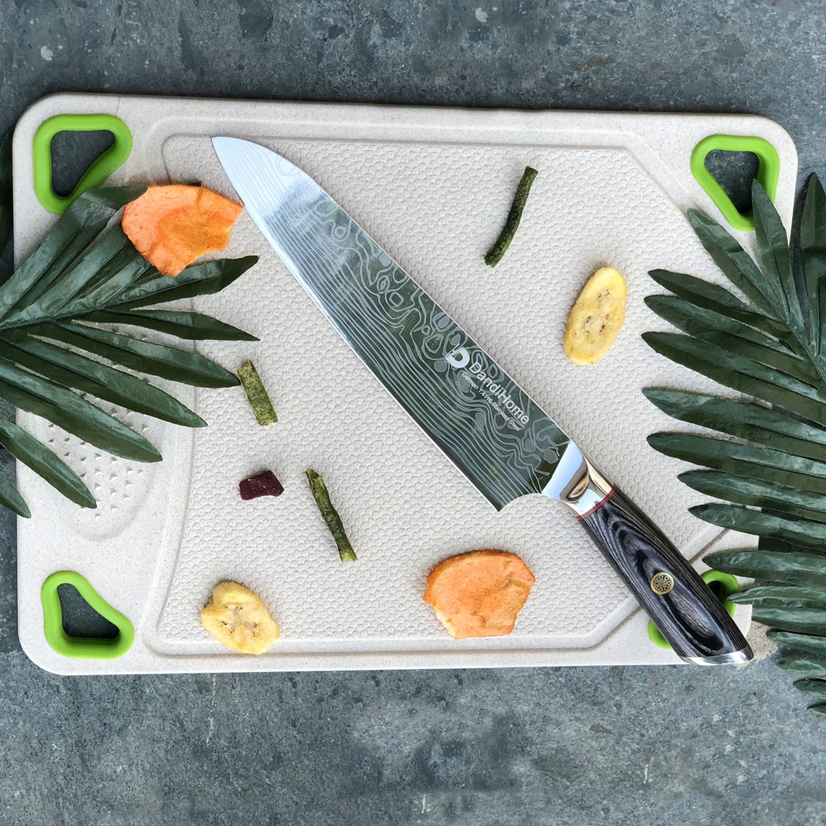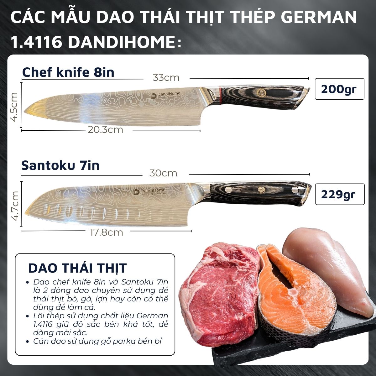 - Dao Santoku: là loại dao thái đa năng, có thể thay thế cho dao đầu bếp trong nhiều trường hợp. Dao Santoku DandiHome có chiều dài lưỡi dao 7 inch. Được làm từ thép German 1.4116 hoặc thép VG10.