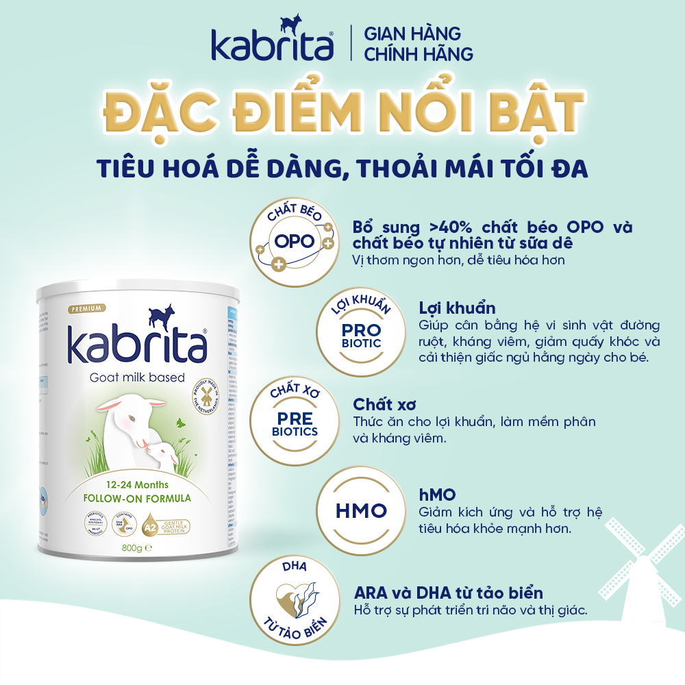 Không chỉ vậy, công thức cải tiến của Kabrita còn bổ sung chất béo tự nhiên từ sữa dê cùng chất béo bổ sung OPO, tăng cường khả năng tiêu hóa và giúp bé hấp thu tối đa dưỡng chất. Sản phẩm cũng chứa đầy đủ vitamin và khoáng chất thiết yếu, hỗ trợ toàn diện sự phát triển trí não, thị giác, hệ miễn dịch và sức khỏe đường ruột của bé.