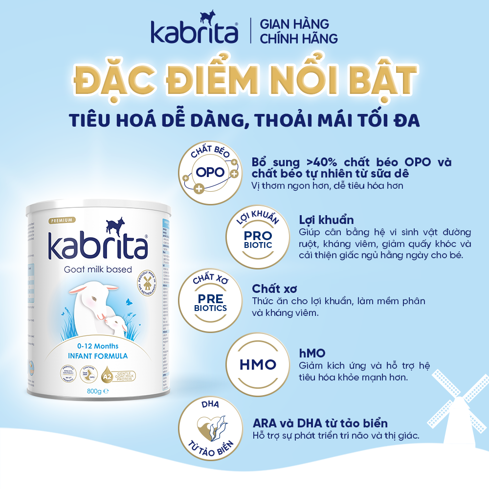 Sữa dê Kabrita với những đặc tính dịu nhẹ có sẵn từ sữa dê, cùng những sáng tạo tân tiến độc quyền, tạo nên một sản phẩm dinh dưỡng dịu nhẹ tối ưu cho hệ tiêu hóa còn non nớt của bé. Hàng triệu ba mẹ trên thế giới đã tin dùng sữa dê Kabrita cho con mình.