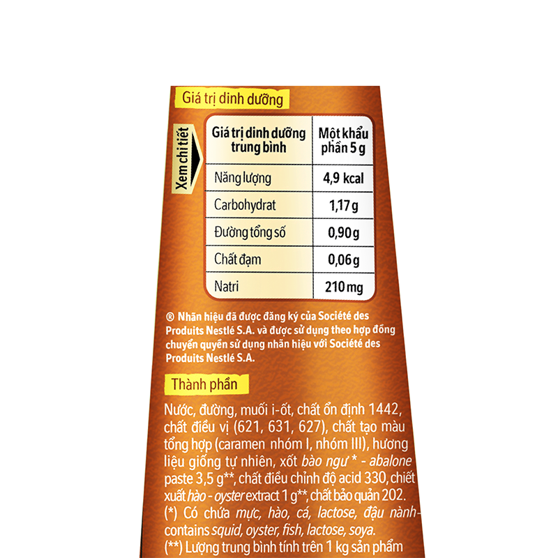 Nước, đường, muối i-ốt, chất ổn định 1442, chất điều vị (621, 631, 627), chất tạo màu tổng hợp (caramen nhóm I, nhóm III), hương liệu giống tự nhiên, xốt bào ngư * - abalone paste 3,5 g**, chất điều chỉnh độ acid 330, chiết xuất hào - oyster extract 1 g**, chất bảo quản 202.