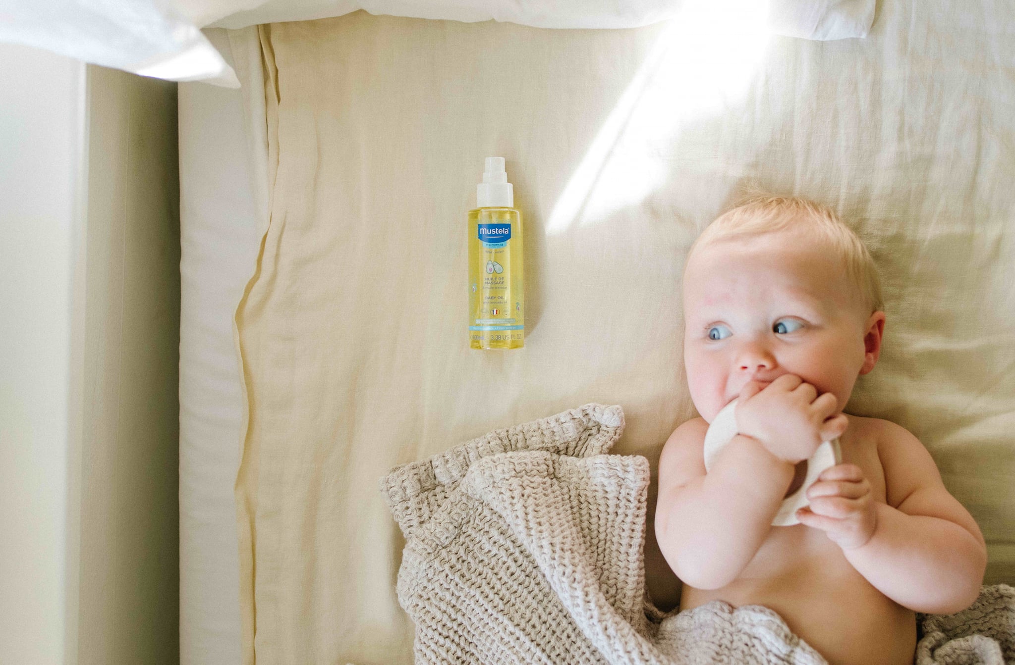 - Mustela Baby Oil giúp kích thích các giác quan của bé và thúc đẩy cảm giác thoải mái. 99% thành phần có nguồn gốc thực vật và được làm giàu bằng tinh dầu hoa quả lựu, dầu hạt hướng dương và dầu quả bơ.