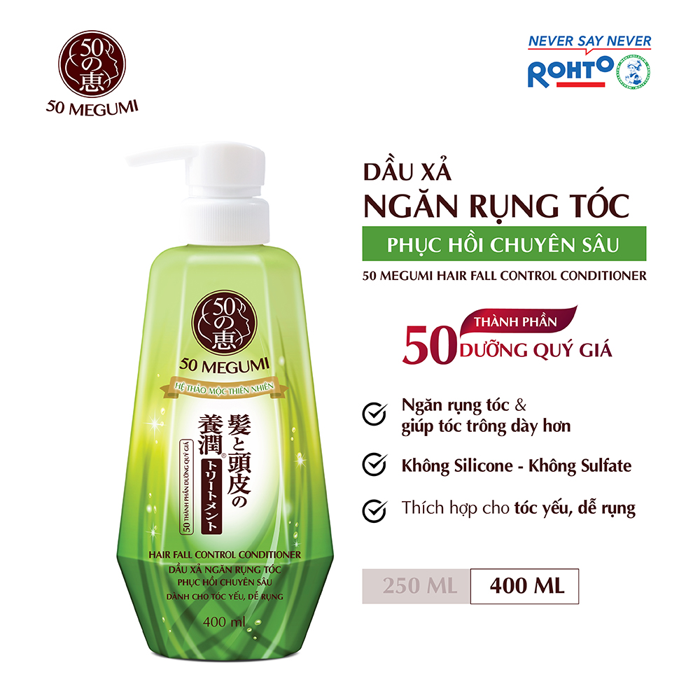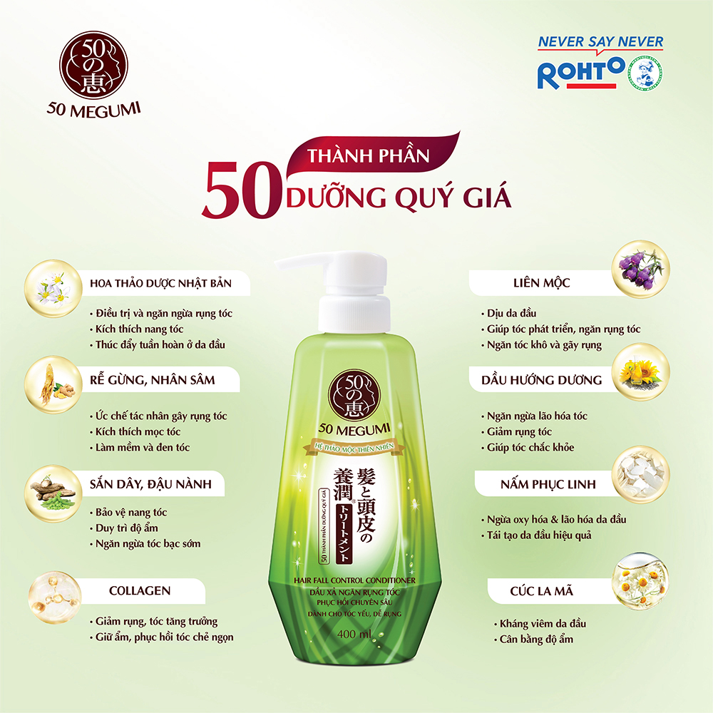 Công thức dưỡng chuyên sâu & dịu nhẹ từ thiên nhiên trong dầu xả ngăn rụng tóc, dưỡng tóc 50 Megumi giúp phục hồi tóc yếu, dễ rụng; nhẹ nhàng dưỡng và cải thiện độ bóng mượt của tóc hơn sau mỗi lần sử dụng