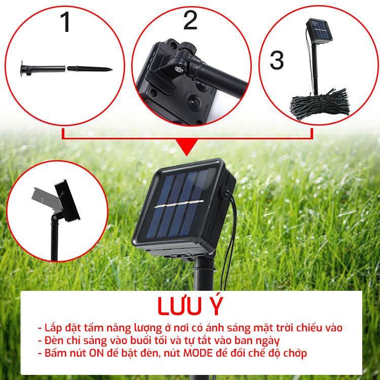 Lưu ý: đèn chỉ sáng khi trời tối nên nếu bạn muốn đèn sáng ban ngày hãy che tấm năng lượng lại, đèn sẽ sáng.