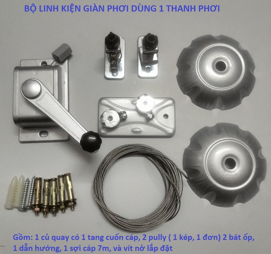 Thông số kỹ thuật Bộ linh kiện giàn phơi đơn, Lắp cho 1 thanh phơi, Củ quay 1 trục quay, Hợp với không gian hẹp chỉ lắp 1 thanh phơi