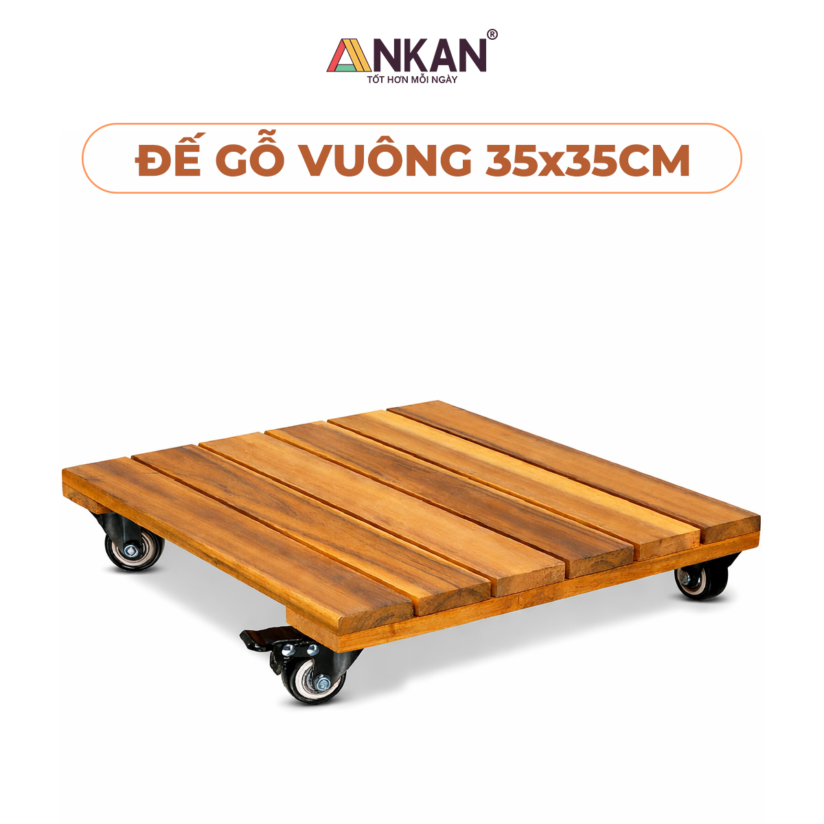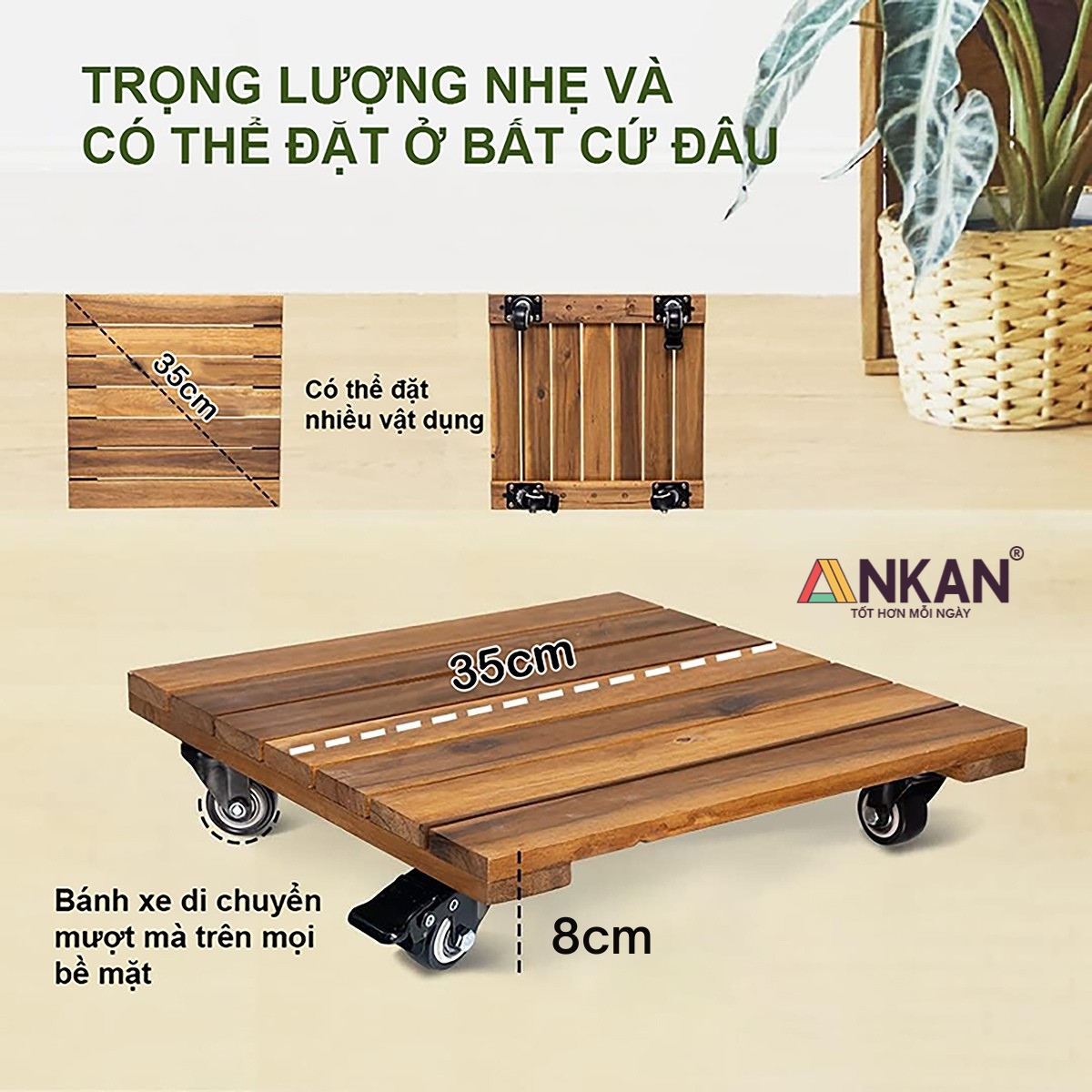 Thông số kỹ thuật Đế Đôn Chậu Cây Có Bánh Xe Cao Cấp ANKAN Hình Vuông Màu Vàng 35x35 Cm Tải trọng 120 Kg Gỗ Tràm Bông