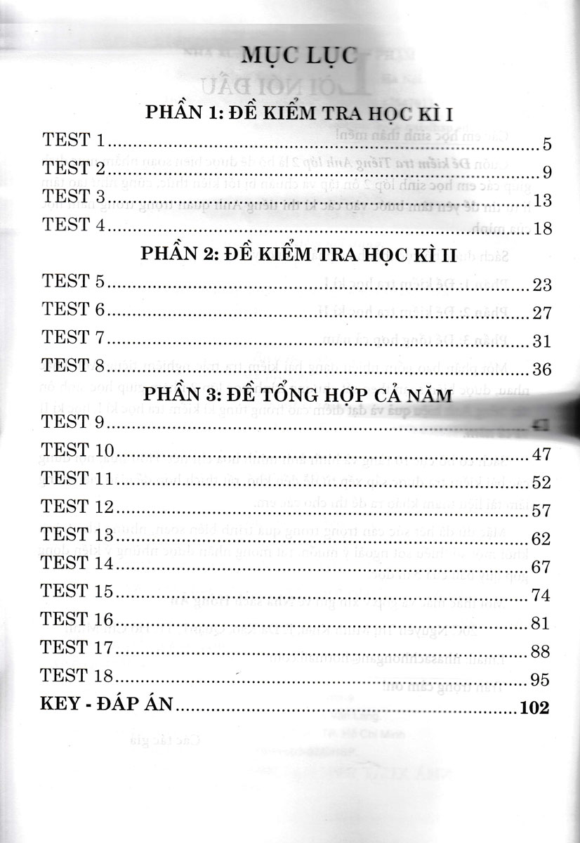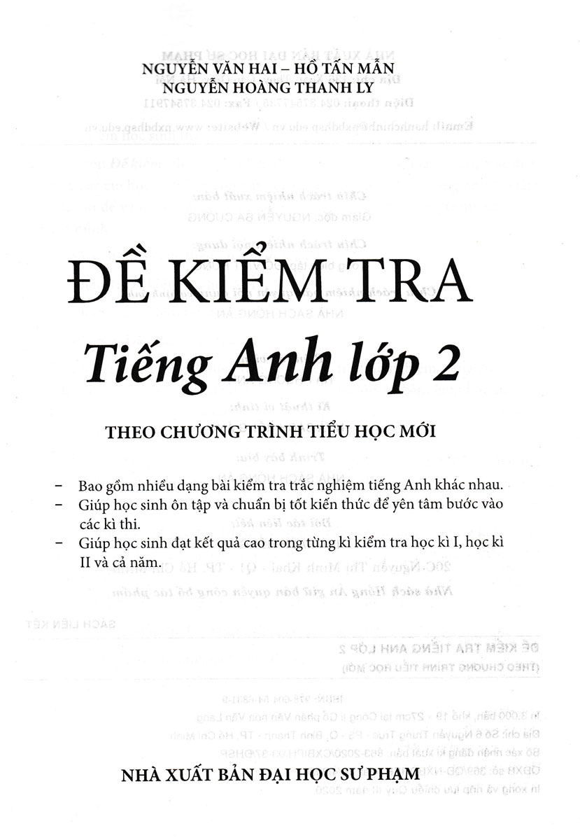 Mỗi phần bao gồm nhiều dạng đề kiểm tra tiếng Anh trắc nghiệm khác nhau, được biên soạn theo sát chương trình học lớp 2 nhằm giúp học sinh ôn tập tiếng Anh hiệu quả và đạt điểm cao trong từng kì kiểm tra học kì I, học kì II và cả năm.