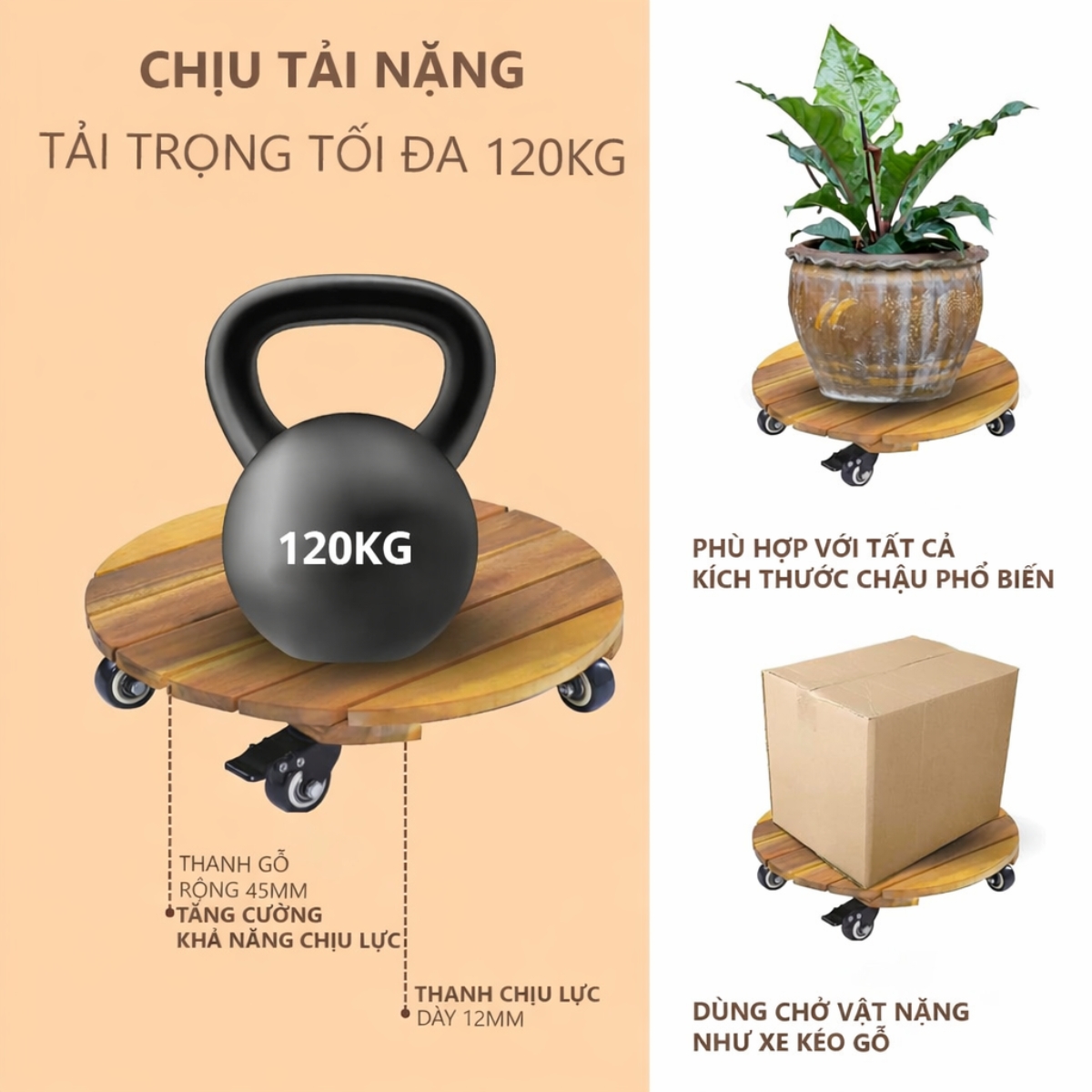 - Bánh xe cao cấp nhất, tải trọng 120Kg, di chuyển mượt mà 360 độ.