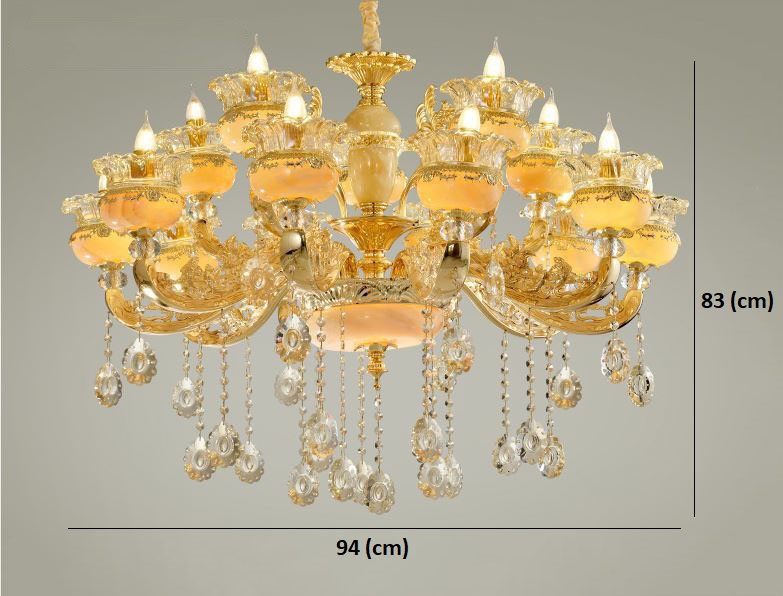 Khung đèn: Khung hợp kim sơn tĩnh điện bền, đẹp. Khung đèn được khéo léo mạ một lớp vàng 18k bên ngoài kết hợp với đá tự nhiên giúp làm tăng độ sang trọng của toàn thể chiếc đèn chùm.