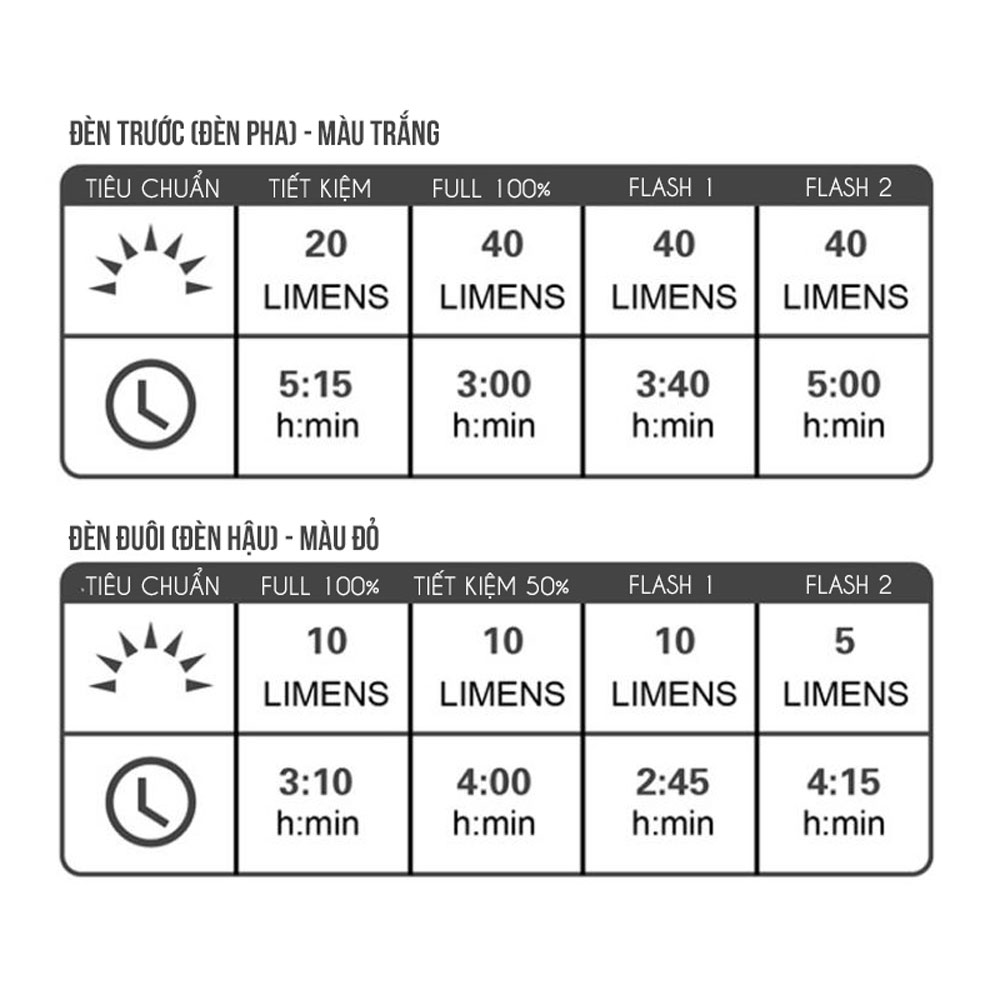 Thời lượng pin khi sử dụng của Đèn pha/ Đèn đuôi xe đạp