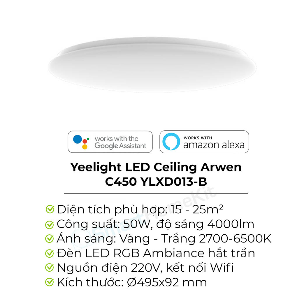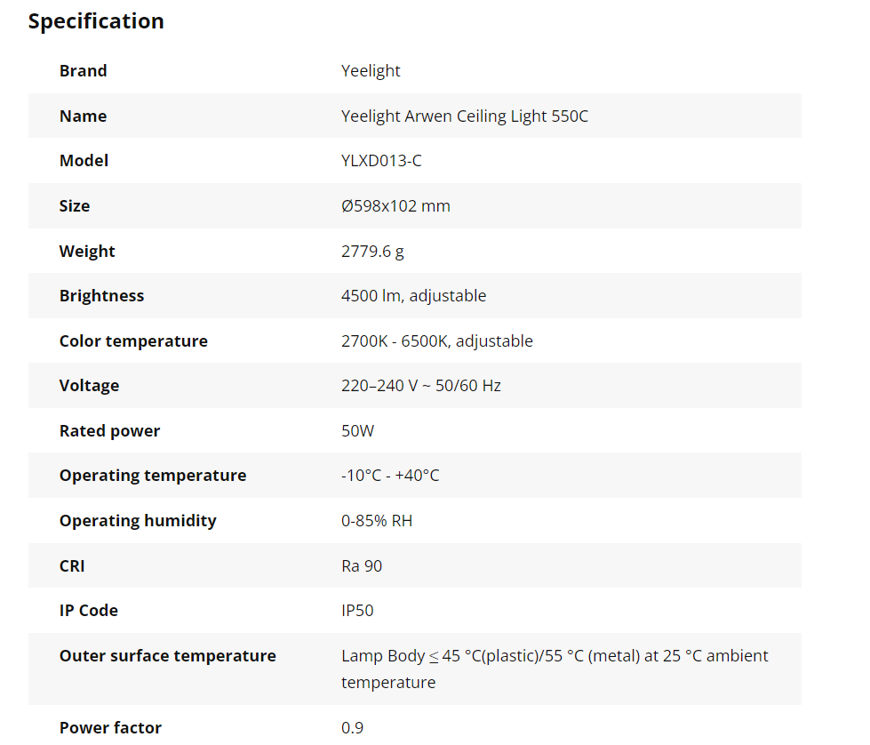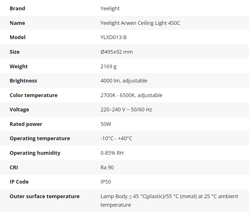 Thông số kỹ thuật Đèn Led Ốp Trần Thông Minh Yeelight Arwen C - 50W - Led RGB hắt trần - Hàng Chính Hãng - Bản Quốc Tế Mihome Global