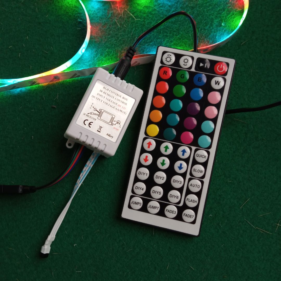 Cuộn dây led 5m có remote từ xa giúp tùy chỉnh các màu sắc qua điều khiển 44 nút loại DIY có thể tùy biến màu sắc bằng cách pha màu tăng giảm các sắc độ của Đỏ / Xanh Lá / Xanh Dương để có thể ra được trên 90 màu sắc.