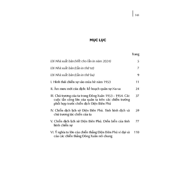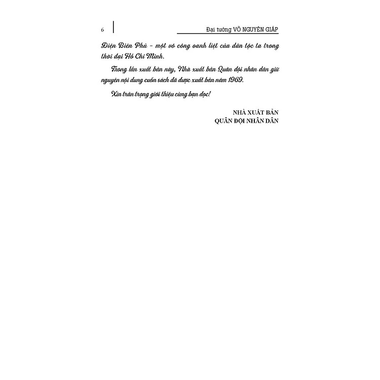 "Nhân dịp kỷ niệm 70 năm chiến thắng Điện Biên Phủ (7.5.1954 - 7.5.2024), Nhà xuất bản Quân đội nhân dân xuất bản cuốn sách “Điện Biên Phủ”. Cuốn sách được Đại tướng Võ Nguyên Giáp viết và xuất bản với các bản in khác nhau vào các năm 1958, 1960, 1964, 1969, nội dung vẫn cònnguyên giá trị hiện thực và ý nghĩa lý luận, thực tiễn sâu sắc vận dụng trong tình hình hiện nay.