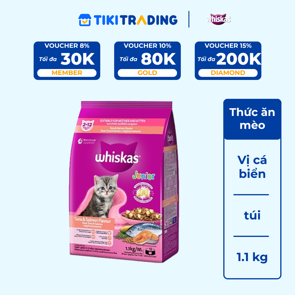 Đồ Ăn Cho Mèo Con Whiskas Vị Cá Biển Và Sữa Dạng Túi 1.1 kg dành cho mèo con, mèo con sơ sinh từ 1-12 tháng, mèo mẹ mang thai, cho con bú. Sản phẩm là điểm khởi đầu cơ sở của một cuộc sống khỏe mạnh và hạnh phúc cho những chú mèo con sau này khi cung cấp đầy đủ dưỡng chất để mèo sơ sinh có thể hấp thu và phát triển khỏe mạnh.