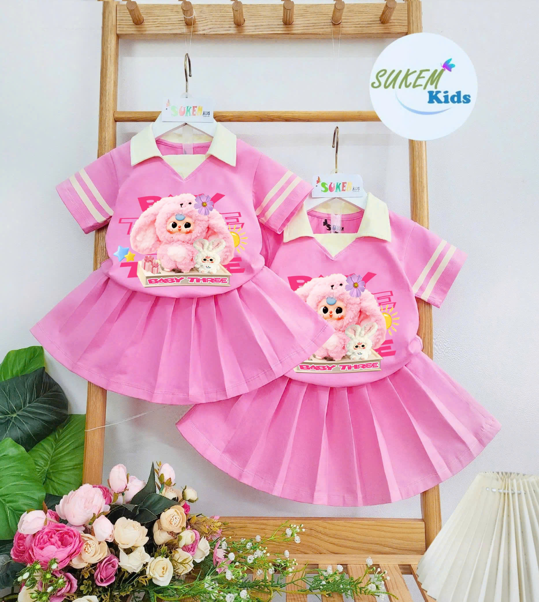 set váy siêu cưng cho bé gái . Chất thun cotton 4c chính phẩm mịn đẹp. ️ áo may cổ trụ phối viền thể thao ép BABY THREE cưng xỉu phom dáng thoải mái với chân váy xếp ly dễ thương cho bé diện hè siêu cute nhé